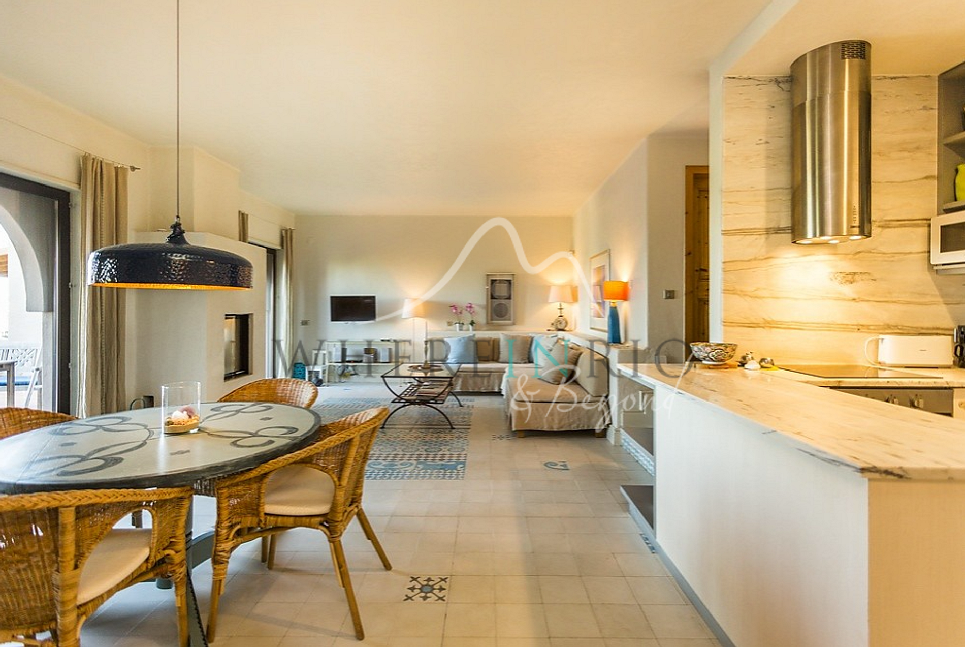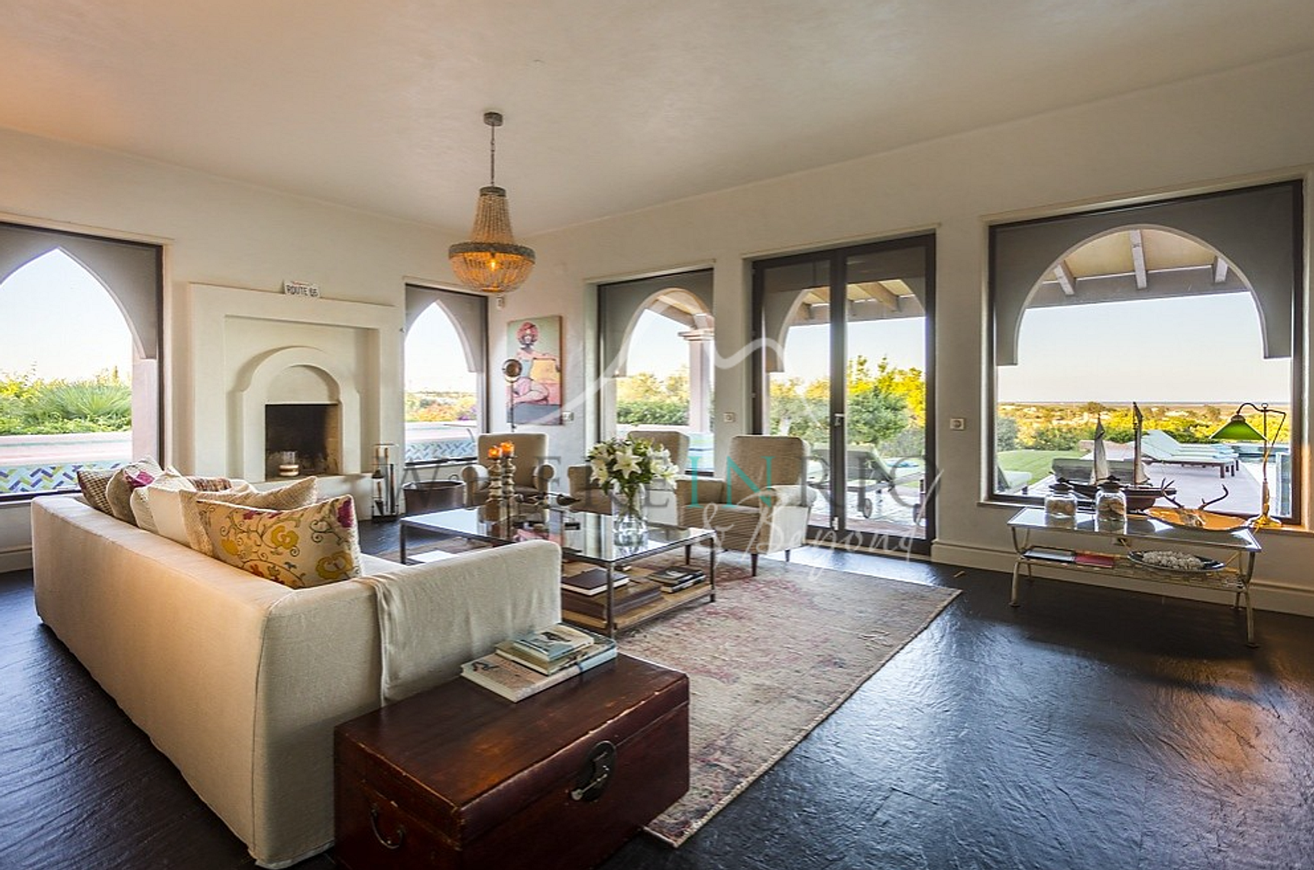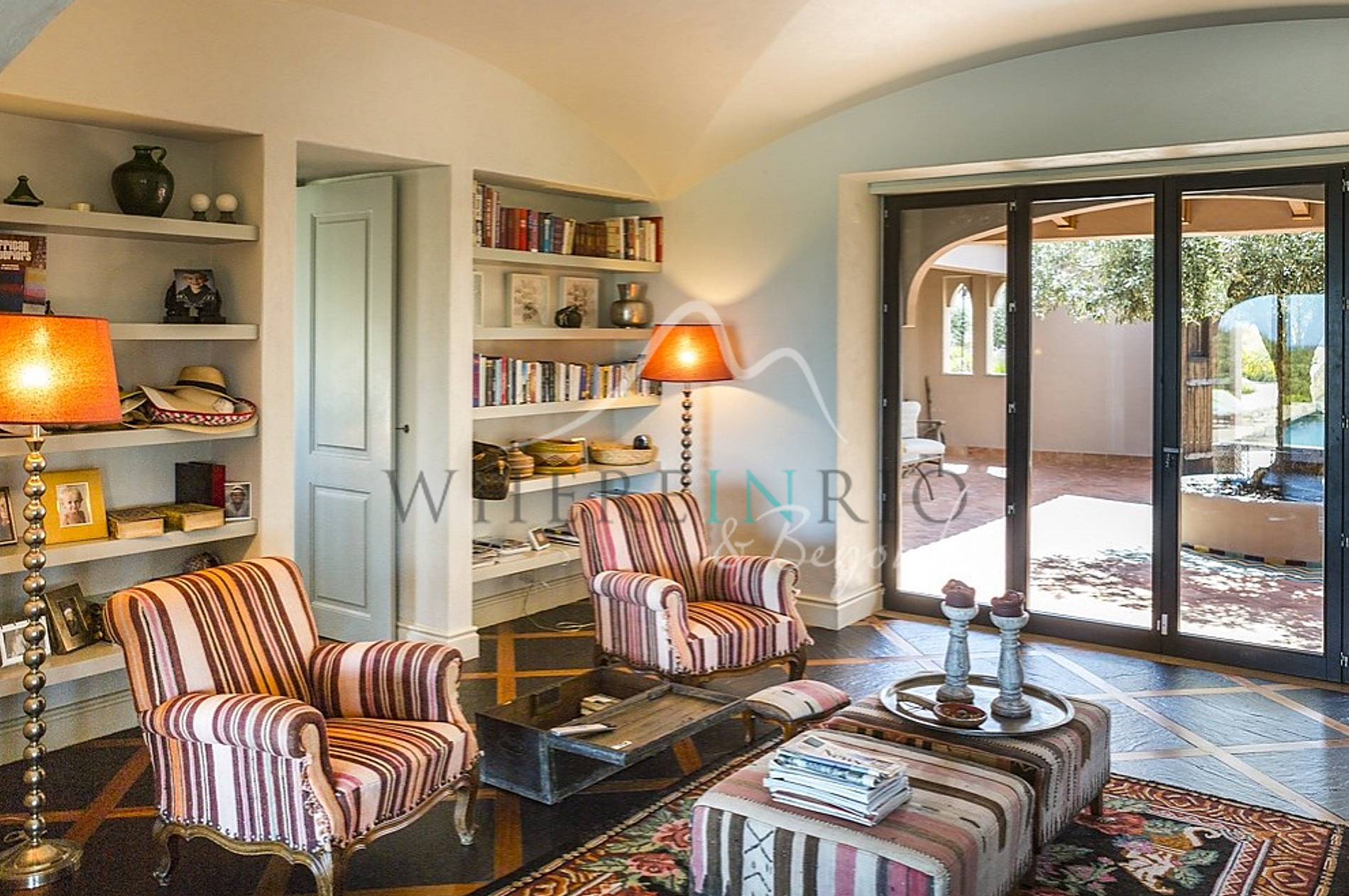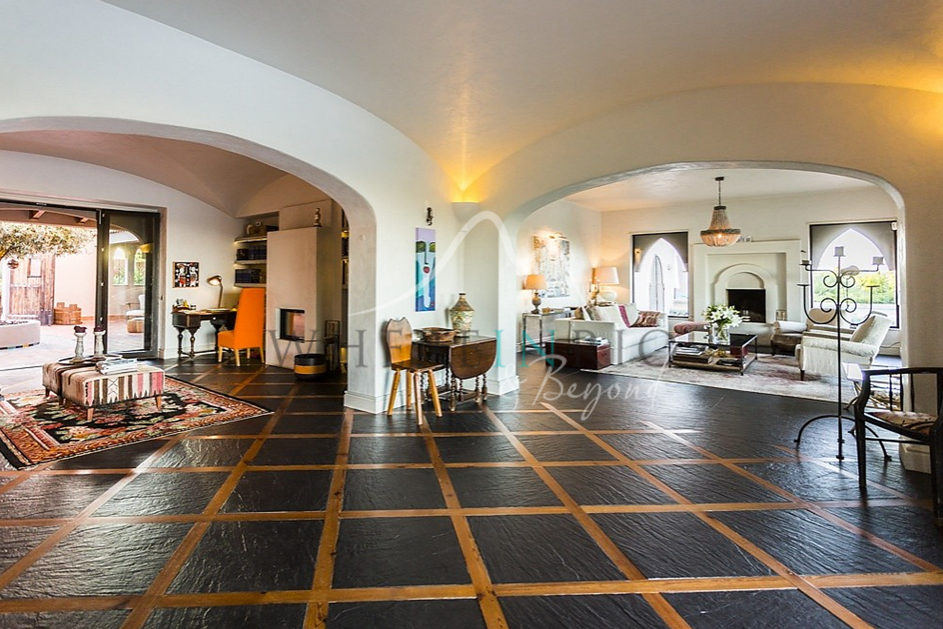 A área de estar exala elegância mourisca, com uma lareira de madeira artesanal e acesso perfeito ao terraço do jardim frontal.