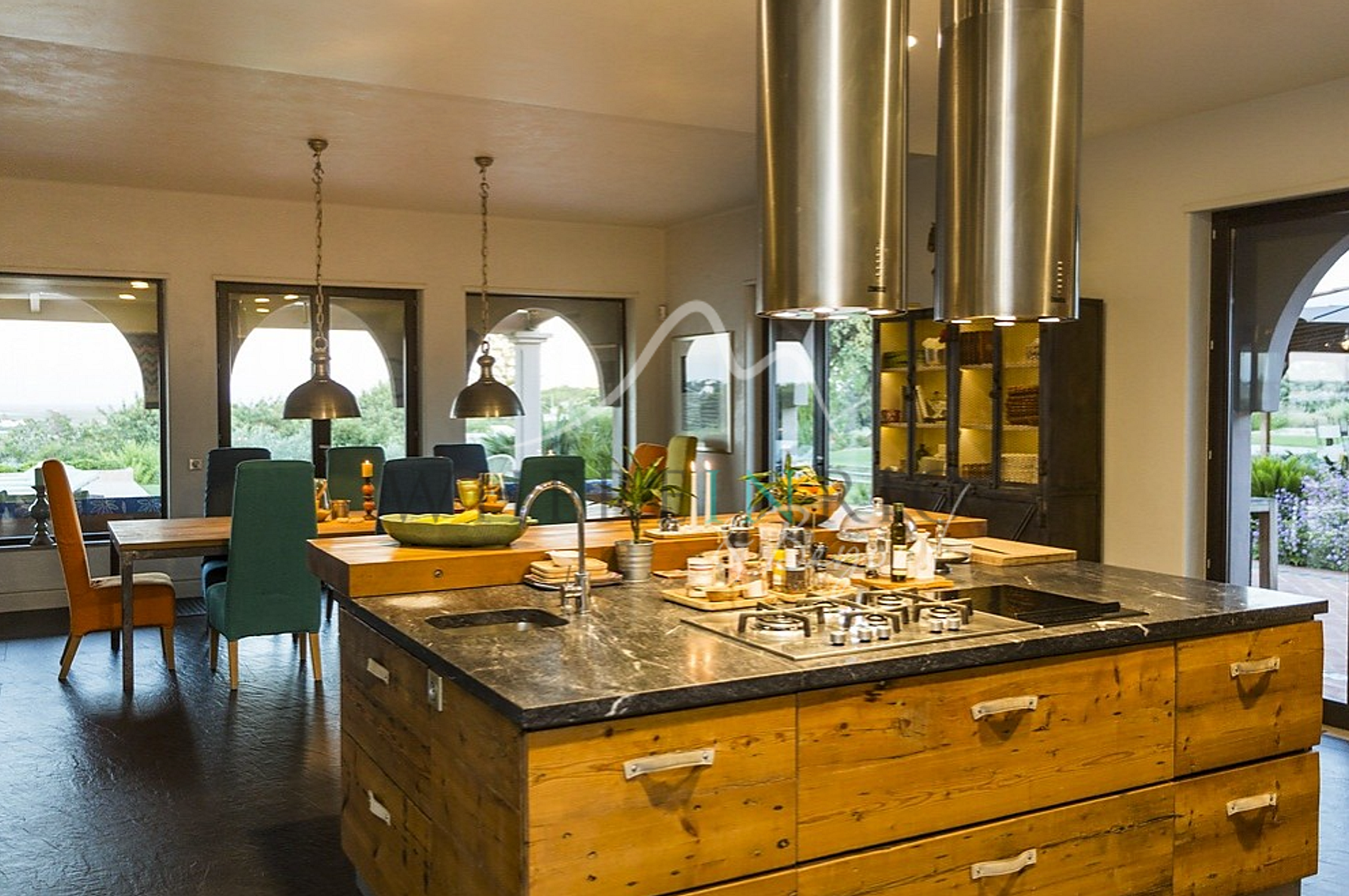 A casa principal possui uma cozinha aberta perfeitamente equipada, centrada em uma ilha central generosamente dimensionada que incentiva experiências culinárias interativas em um ambiente descontraído.