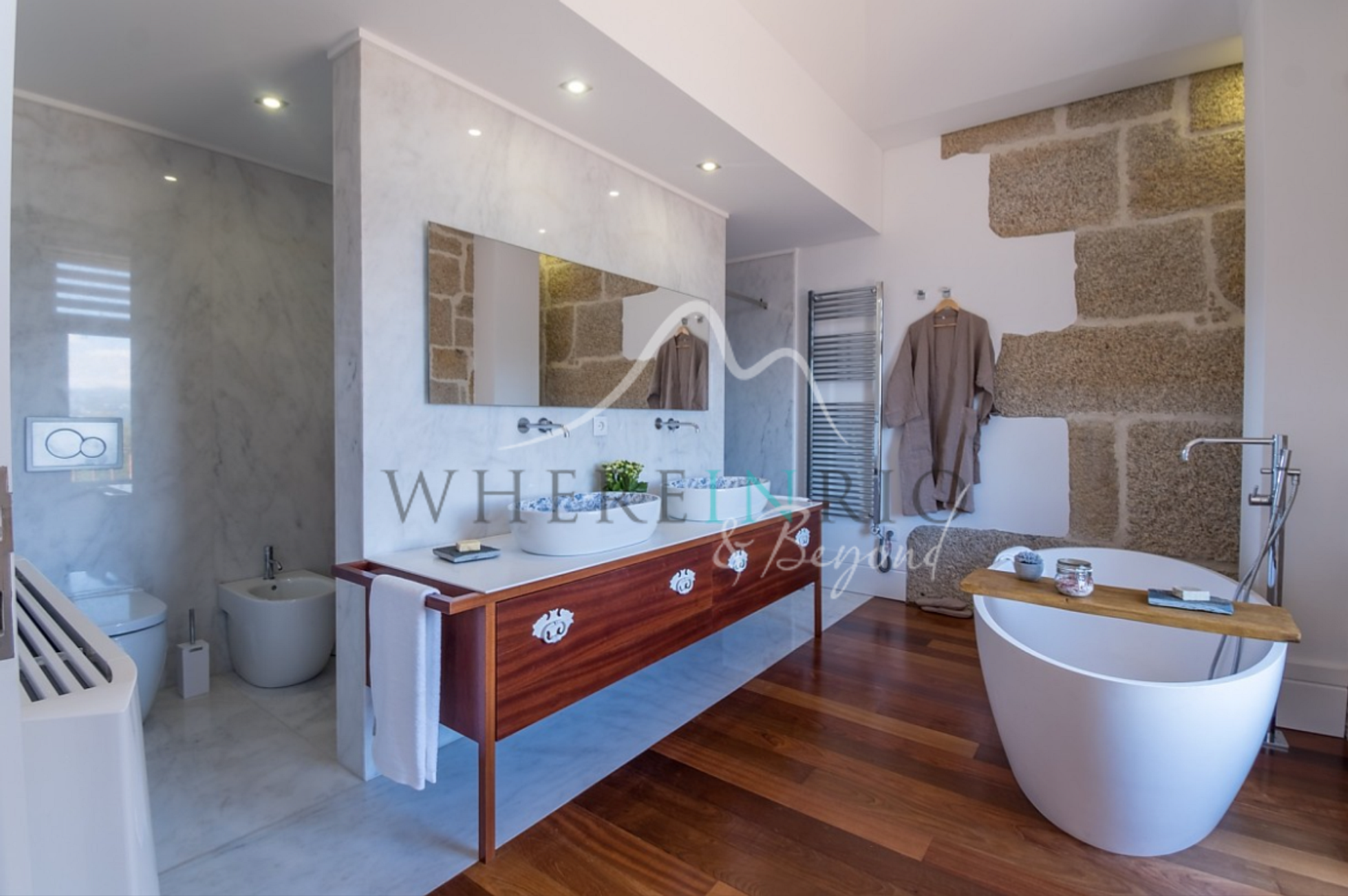 A fazenda convertida exala charme com suas paredes exteriores azuis e brancas, suas amplas suítes master e seus quartos adicionais que acomodam confortavelmente até catorze pessoas. Distribuído em três pisos, o interior conta com confortos modernos, como ar-condicionado, WiFi, roupas de cama luxuosas e banheiros elegantes, mantendo ao mesmo tempo um ambiente aconchegante. Os hóspedes podem desfrutar de uma experiência de spa com a jacuzzi e a sauna, e degustar ovos e leite fresco da fazenda local Maronesa, juntamente com um serviço de limpeza diário. A Fazenda de Luxo do Douro oferece a base perfeita para uma variedade de atividades, desde degustações de vinho até oficinas de cerâmica, tudo facilmente organizado pelo serviço de concierge para uma estadia inesquecível.