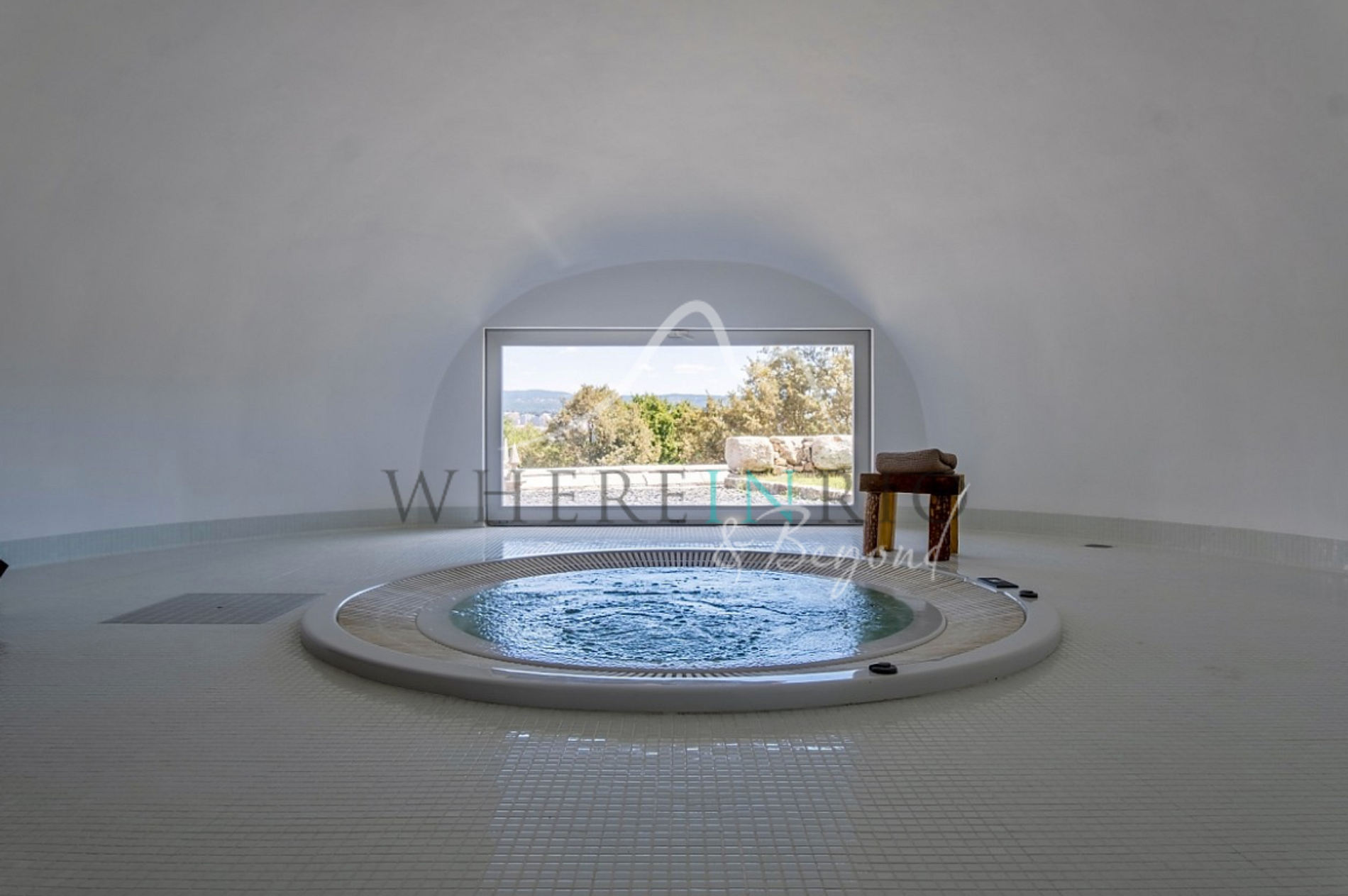 A casa da piscina, que combina habilmente o interior e o exterior com suas portas de correr e claraboias, proporciona uma conexão serena com a natureza. Vários locais isolados, incluindo uma área de estar ao ar livre em terraço e uma varanda, oferecem ambientes idílicos para desfrutar de um café pela manhã ou de um copo de vinho à tarde.