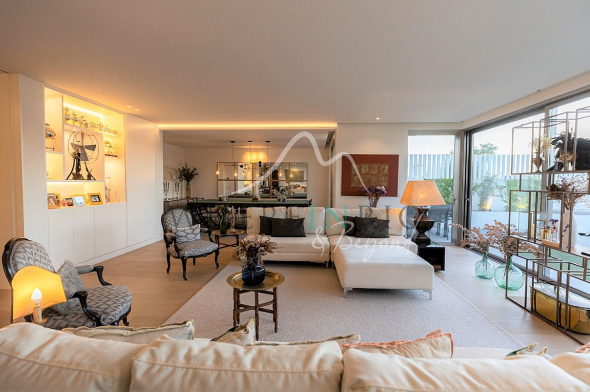 No interior, a sala de estar principal apresenta sofás brancos macios, unidades de prateleiras iluminadas e portas de vidro do chão ao teto que se abrem para o terraço.