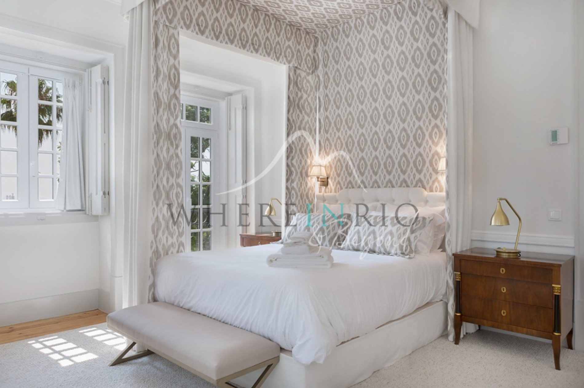A partir do grande hall, uma espaçosa sala de estar formal convida à descontração e ao entretenimento para os hóspedes. Sua decoração elegante, porém discreta, reflete o estatuto estimado que esta villa já teve. Equipada com uma grande TV inteligente de tela plana e internet de fibra óptica de alta velocidade, os hóspedes podem manter-se conectados com suas mídias preferidas. As portas francesas abrem para um charmoso pátio sombreado por uma pérgula de vigas de madeira, oferecendo um ambiente idílico para refeições ao ar livre durante os meses mais quentes. Adjacente, uma impressionante sala de jantar formal pode acomodar até 14 convidados ao redor de uma bela mesa de carvalho maciço, criando uma atmosfera inesquecível para encontros com entes queridos. Uma lareira em uma das extremidades acrescenta calor à atmosfera. A cozinha moderna, luminosa e bem equipada, possui os mais recentes eletrodomésticos, incluindo uma grande geladeira freezer dupla com dispensador de água e gelo. Os hóspedes são bem-vindos para preparar suas refeições favoritas, com amplo espaço fornecido pela ilha de cozinha em mármore. No andar de cima, o primeiro andar abriga um quarto duplo bem equipado com banheiro privativo e outro quarto com uma impressionante cama de casal com dossel de tecido, com vistas panorâmicas para a floresta de pinheiros do Parque Monsanto e a Ponte 25 de Abril que atravessa o rio Tejo. Outro quarto de hóspedes duplo compartilha um banheiro, enquanto uma biblioteca de estudo oferece um espaço tranquilo para a contemplação.