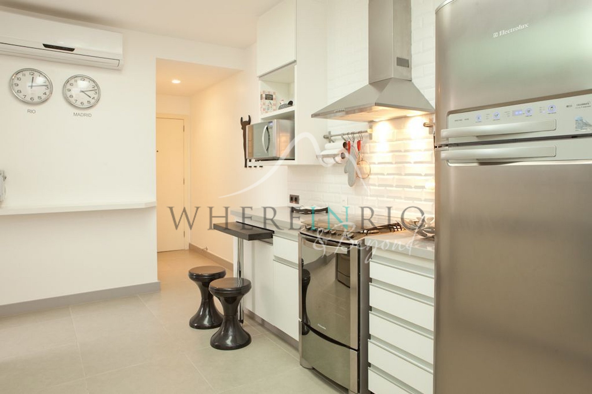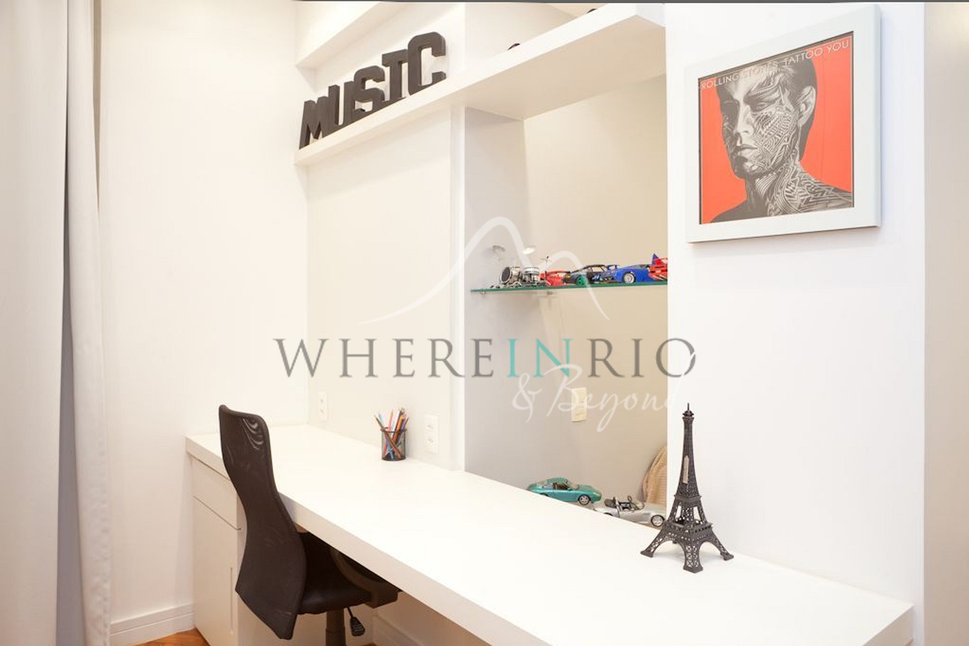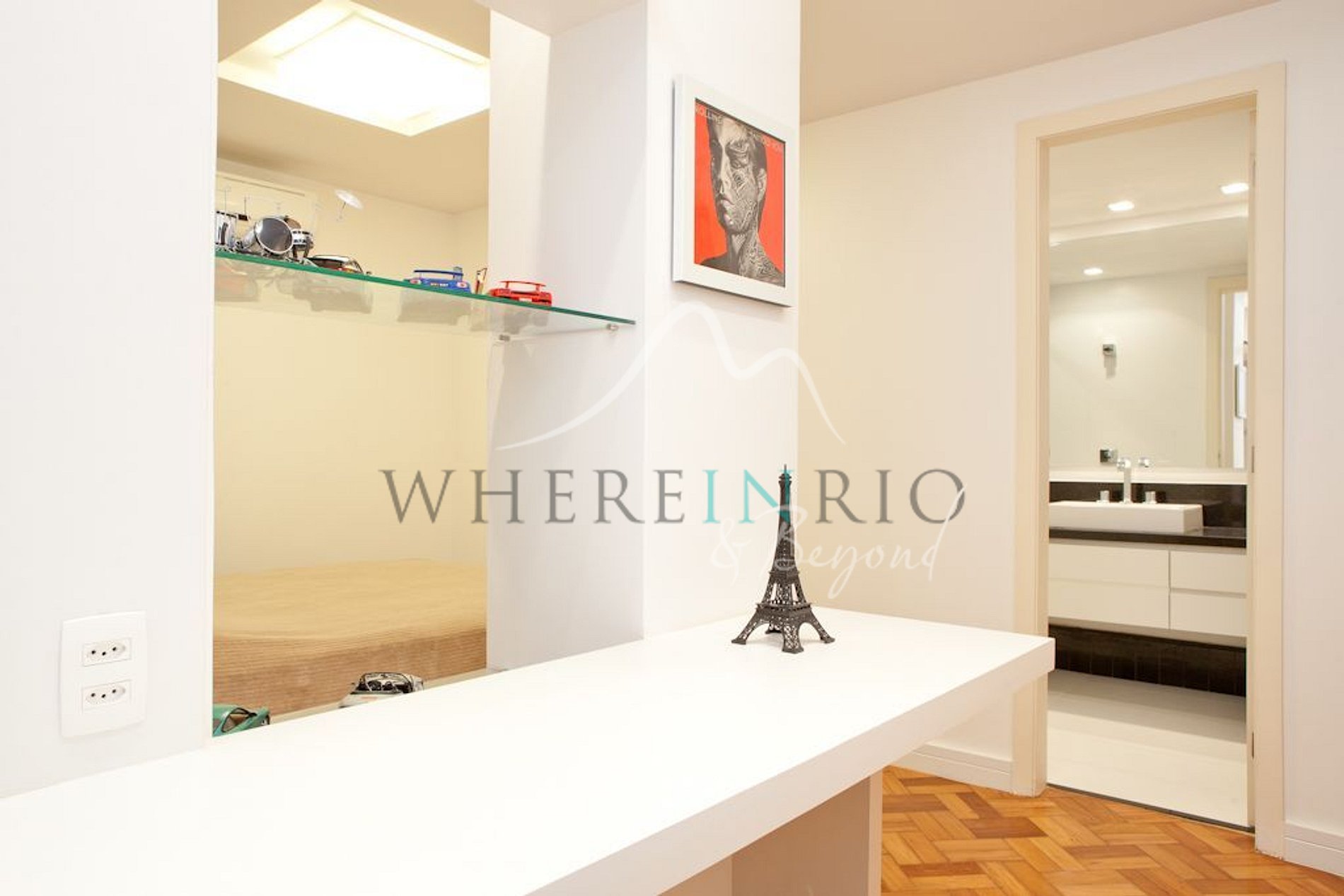 O imóvel possui três quartos amplos, todos com camas de casal. A suíte principal conta com um grande closet e TV de parede. O segundo quarto tem uma escrivaninha perfeita para leitura ou trabalho. Todas as dependências são arejadas e bem iluminadas. A sala de estar e jantar é ampla e oferece uma vista deslumbrante da Praia de Copacabana, ideal para aproveitar o nascer do sol. A cozinha é moderna e equipada com fogão, forno, geladeira e micro-ondas.