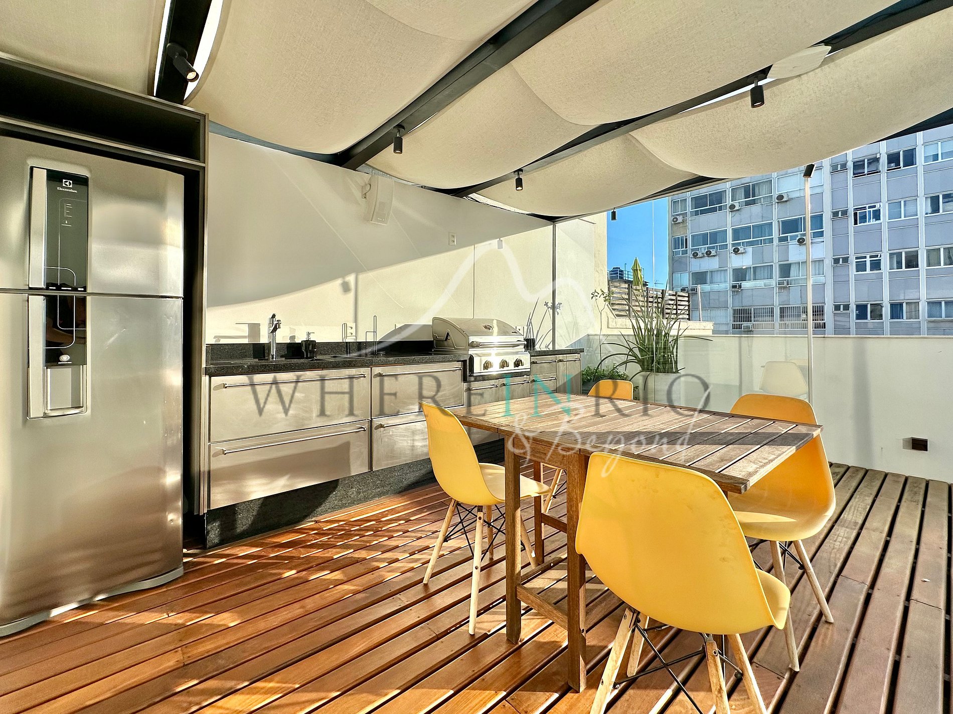 Os hóspedes têm acesso total à cobertura, piscina, churrasqueira e todas as áreas externas.