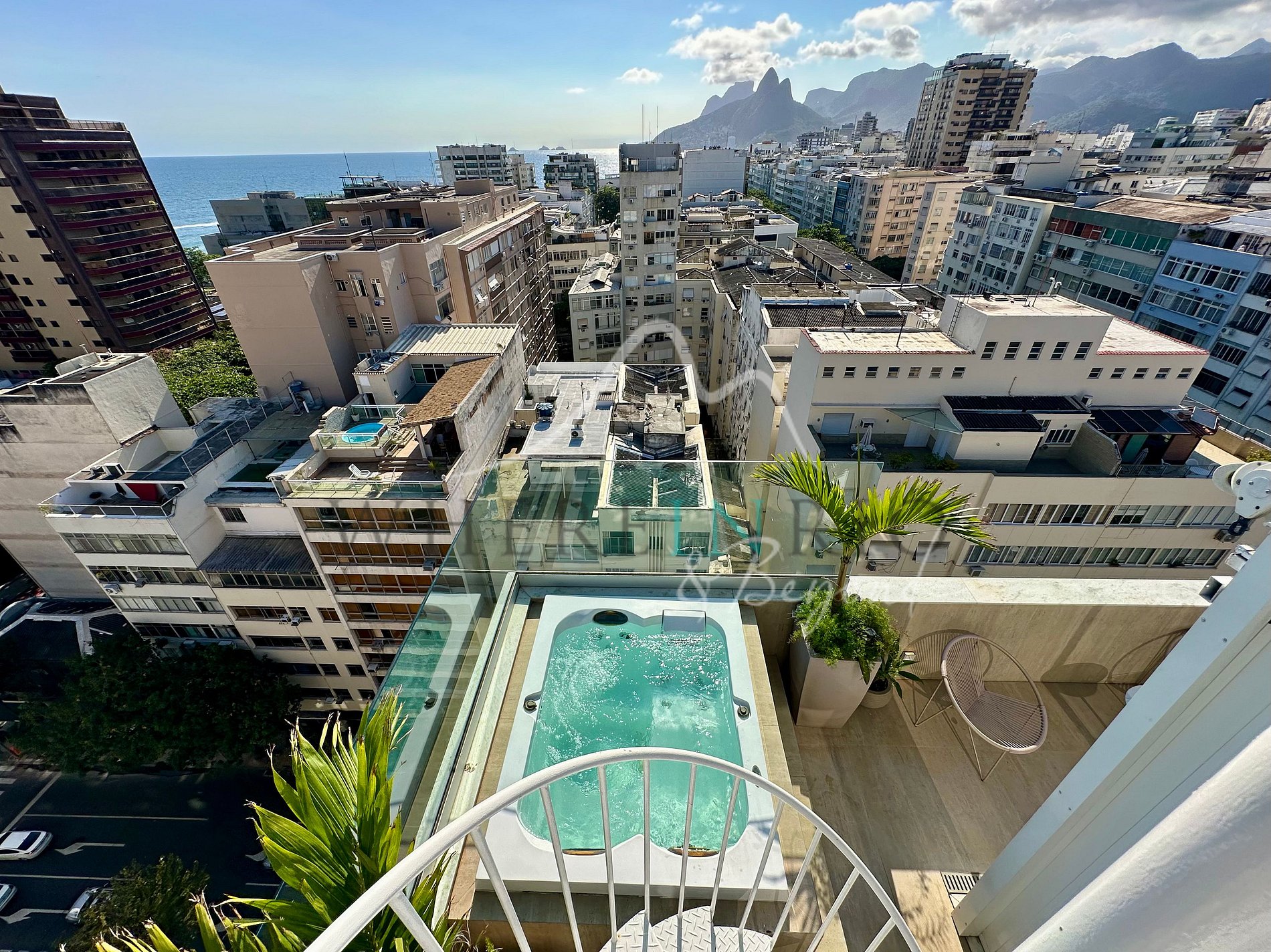 Esta belíssima cobertura triplex conta com duas suítes espaçosas, cada uma com banheiro em mármore e varanda privativa. No primeiro andar, há uma ampla sala de estar e jantar que se abre para o terraço, além de uma cozinha totalmente equipada. No terceiro andar, o terraço com jacuzzi oferece uma vista panorâmica de 360° do Rio de Janeiro e do Morro Dois Irmãos — o local ideal para apreciar o pôr do sol com um coquetel. Os hóspedes também têm acesso à sauna, piscina, academia e estacionamento do edifício.