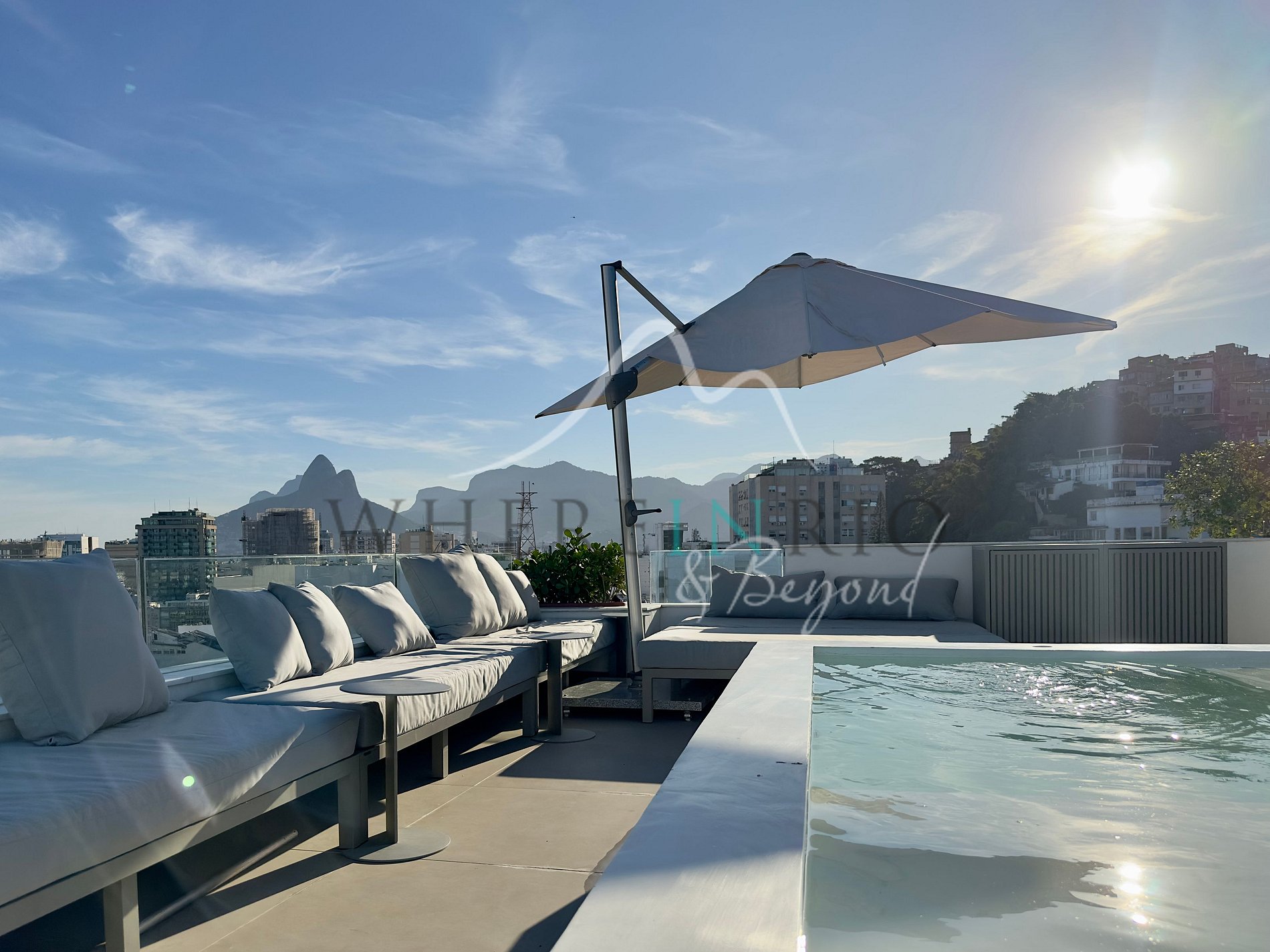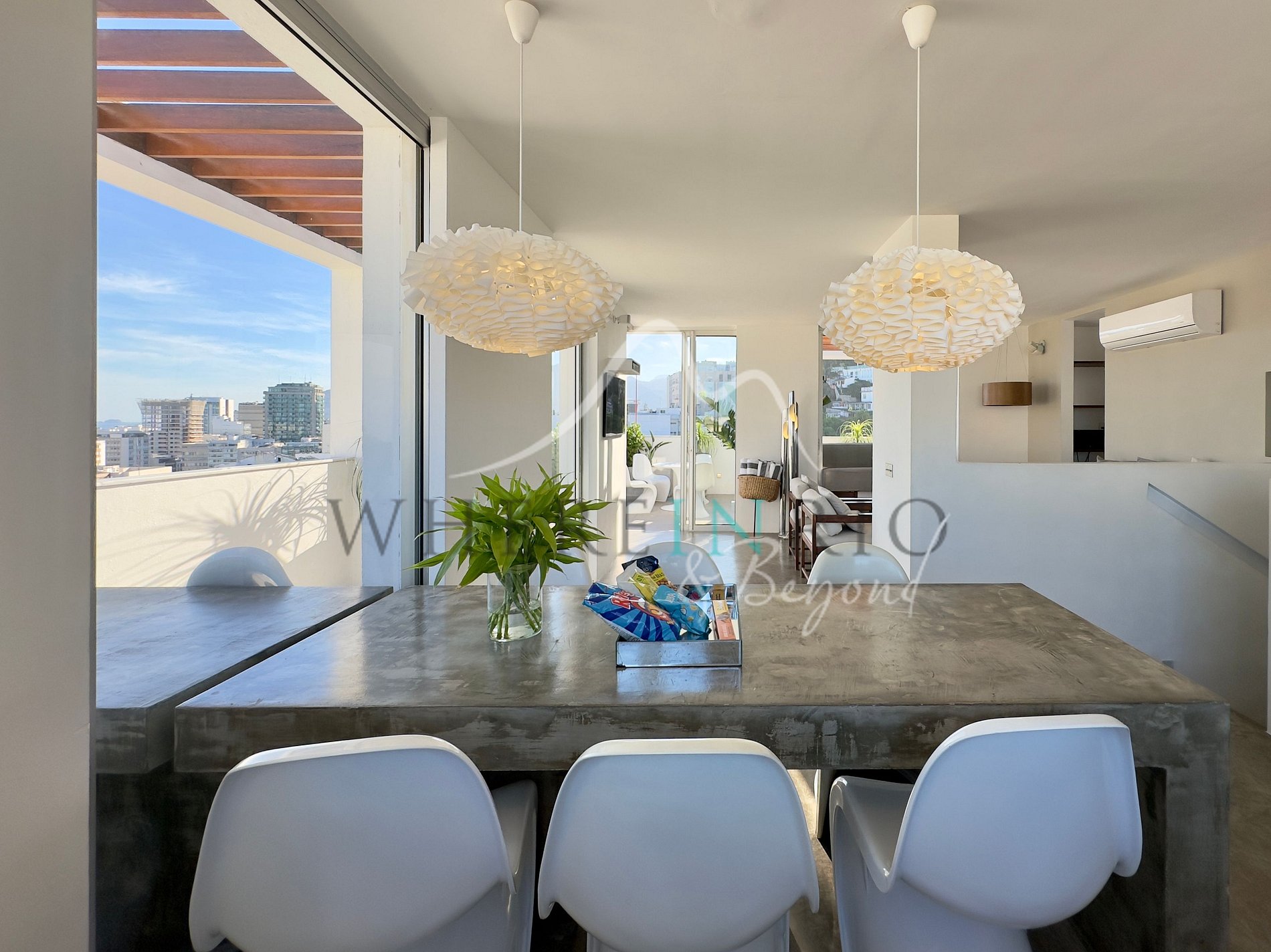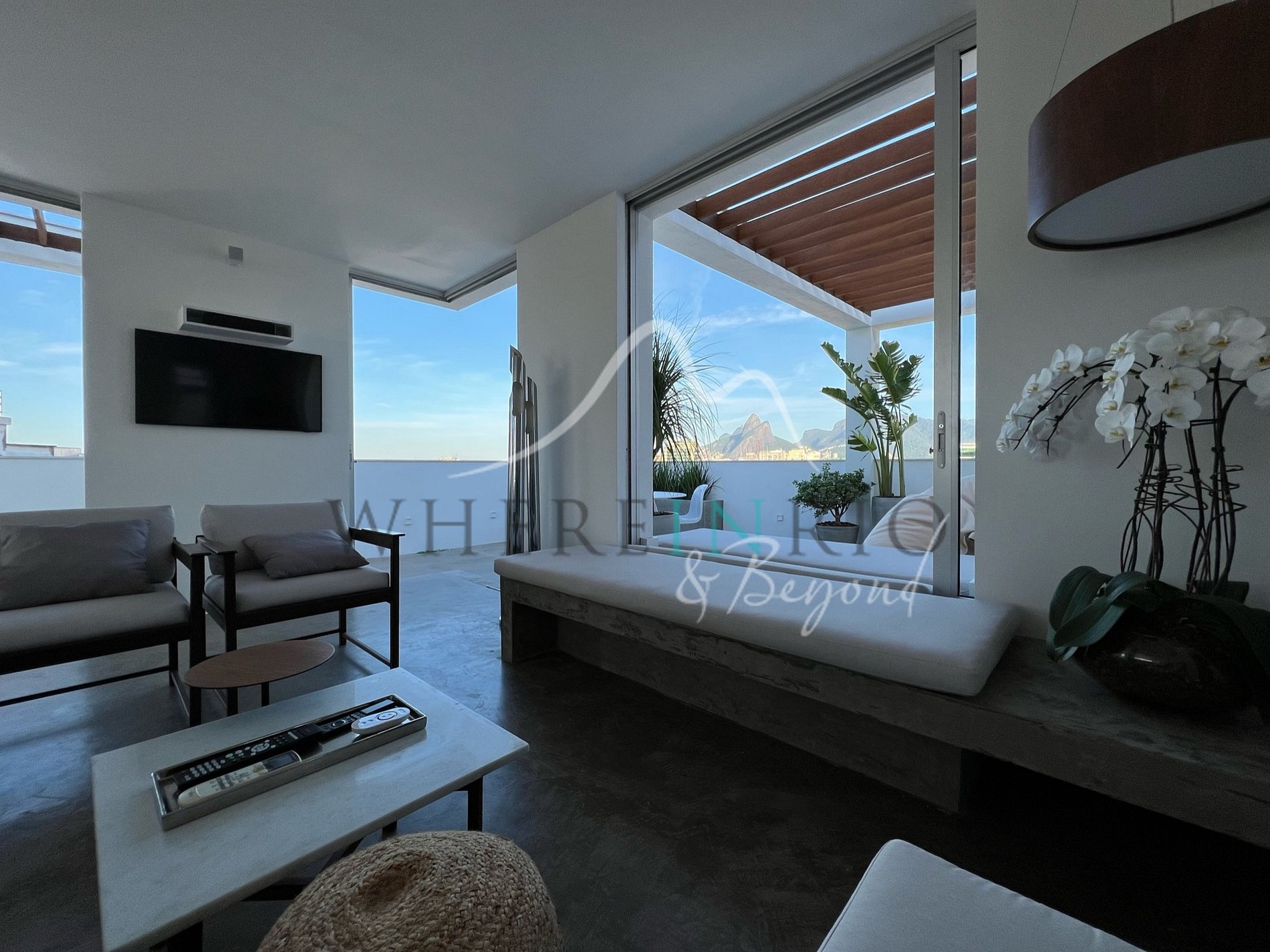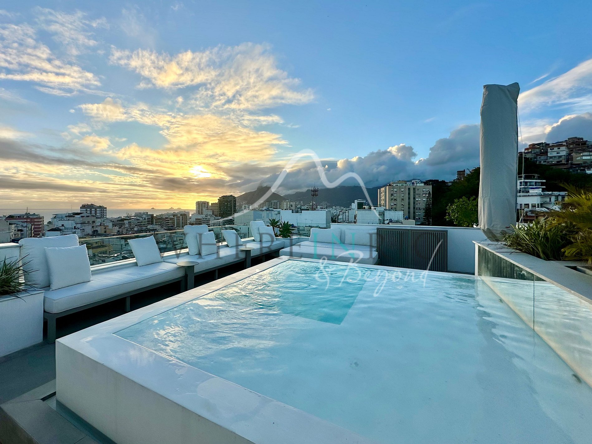 Este triplex iluminado possui quatro suítes: duas com banheiros completos e duas com chuveiro e pia, além de lavabo de apoio. Sala de estar confortável, cozinha americana totalmente equipada e sala de jantar com portas de correr que se abrem para uma ampla varanda com vista panorâmica. O grande destaque é o terraço privativo com piscina, que oferece vistas extraordinárias do Pão de Açúcar, do oceano e do horizonte do Rio—um espetáculo mágico à noite.