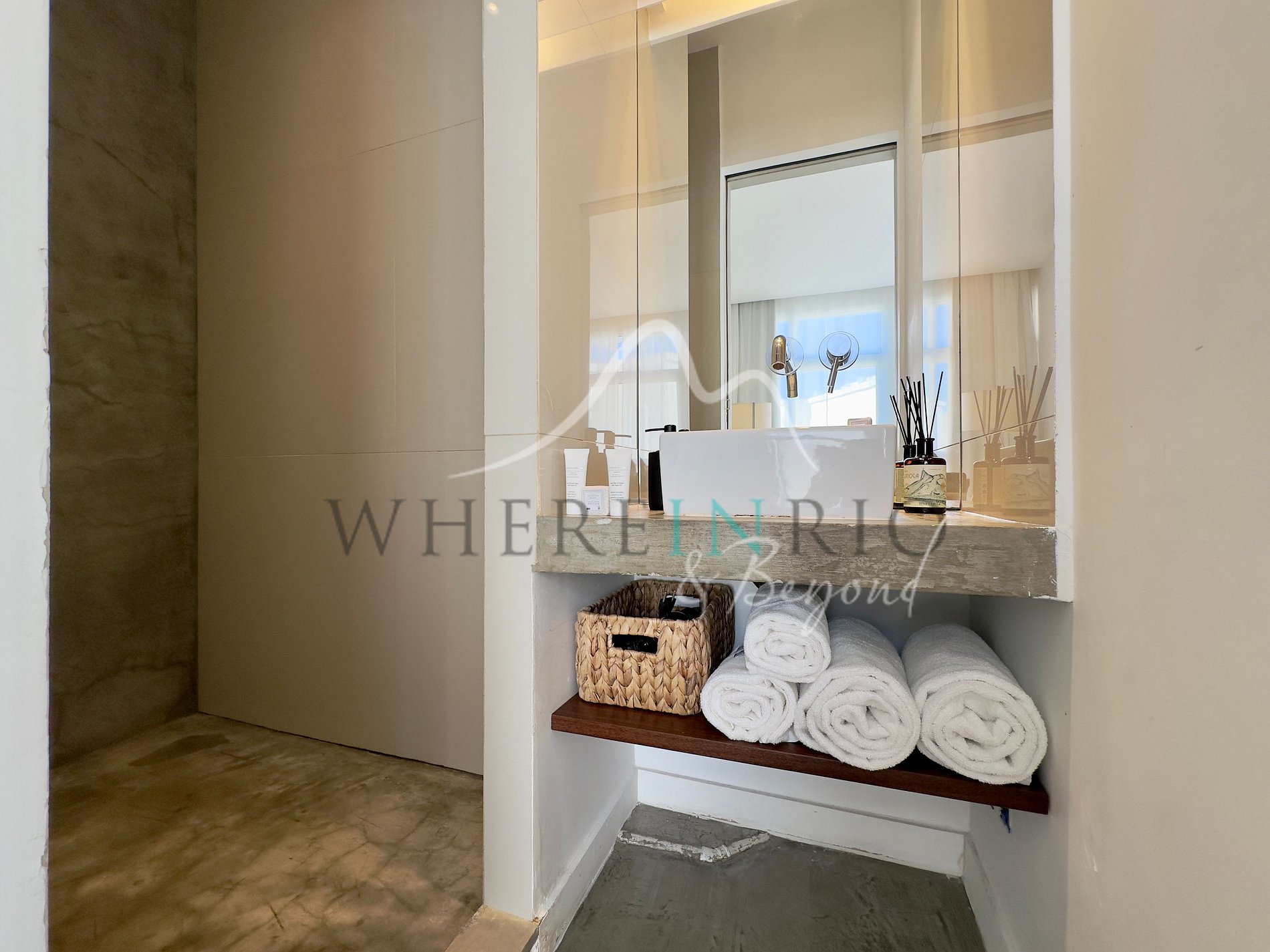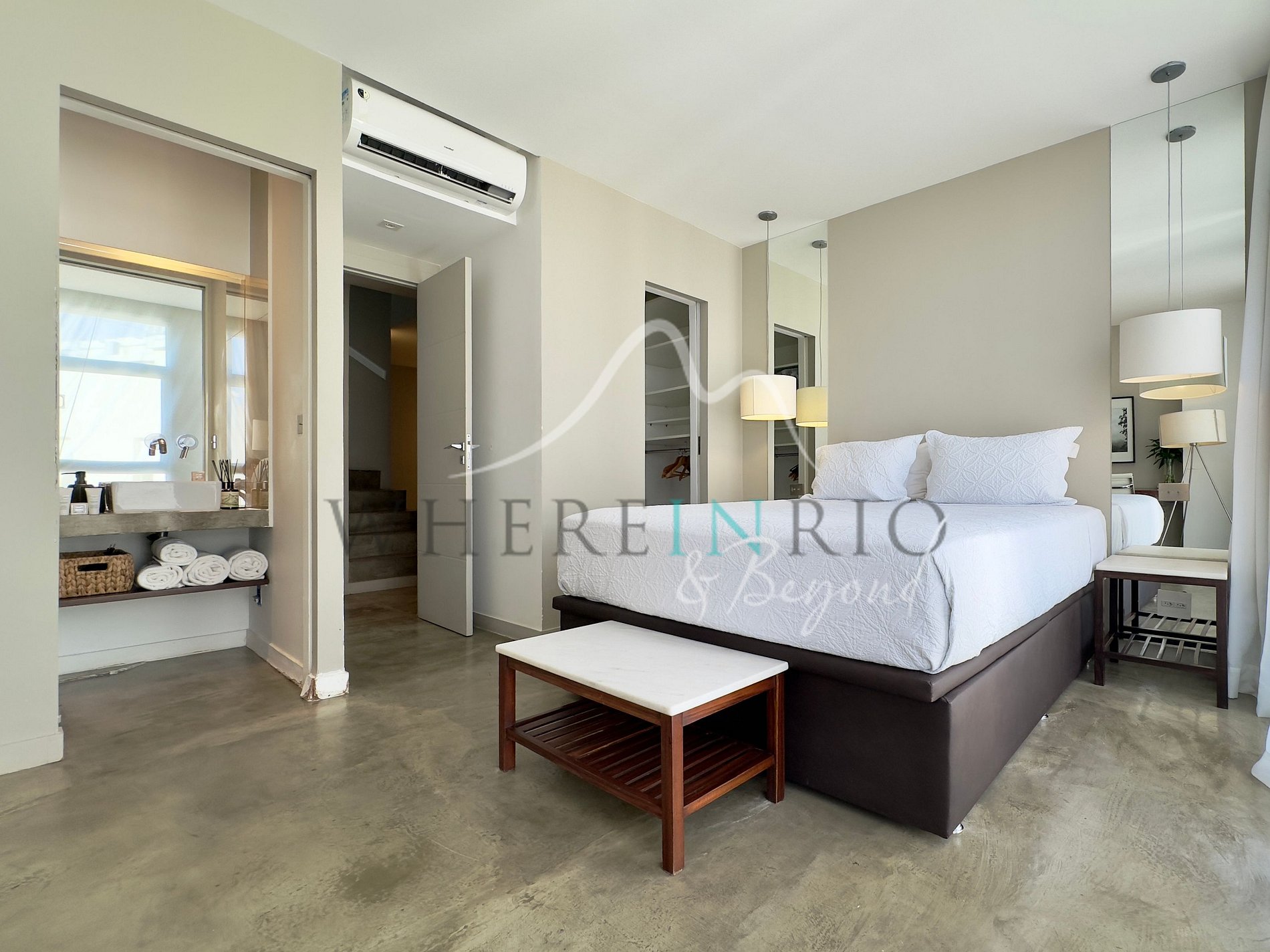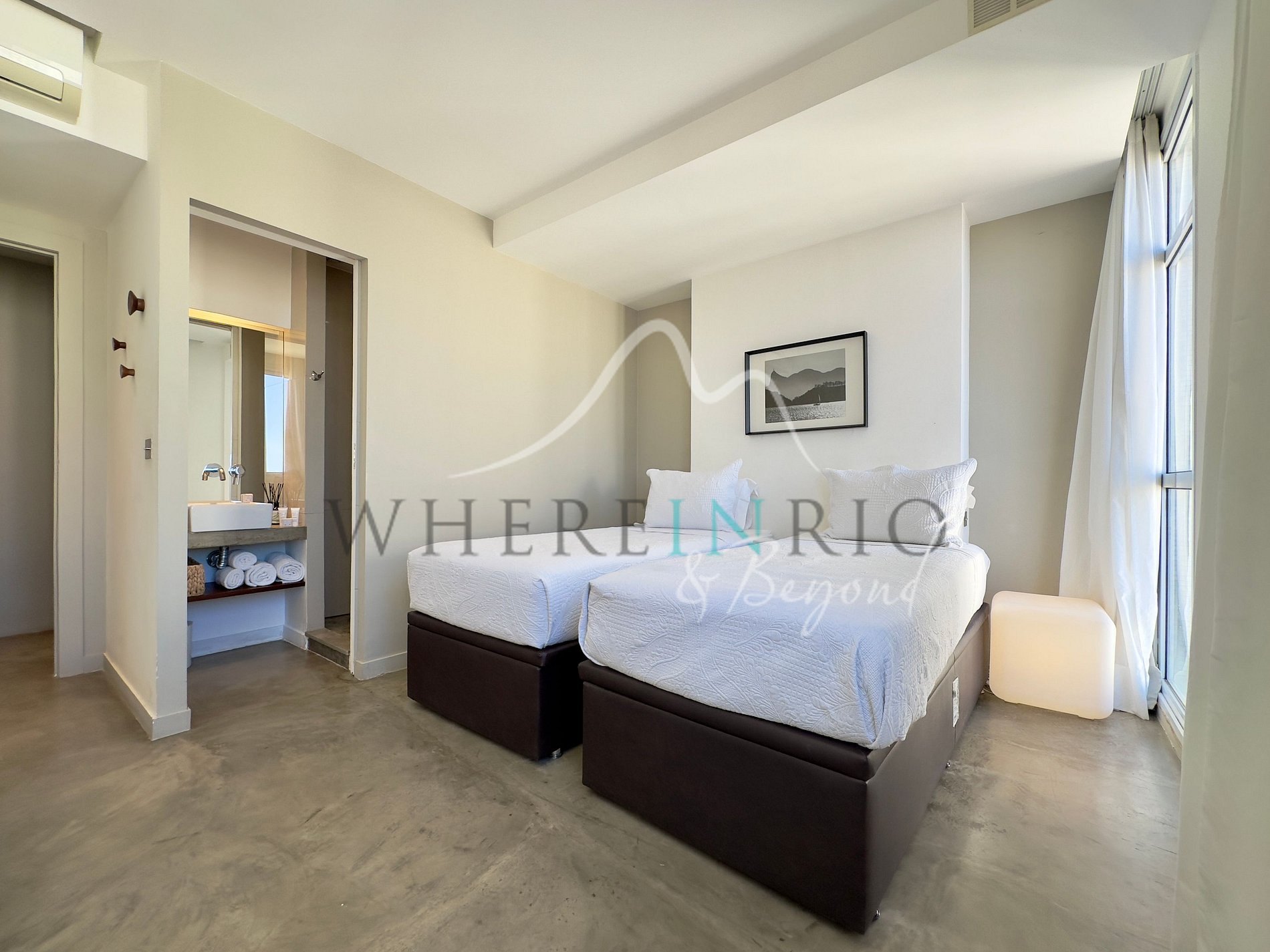 Este triplex iluminado possui quatro suítes: duas com banheiros completos e duas com chuveiro e pia, além de lavabo de apoio. Sala de estar confortável, cozinha americana totalmente equipada e sala de jantar com portas de correr que se abrem para uma ampla varanda com vista panorâmica. O grande destaque é o terraço privativo com piscina, que oferece vistas extraordinárias do Pão de Açúcar, do oceano e do horizonte do Rio—um espetáculo mágico à noite.
