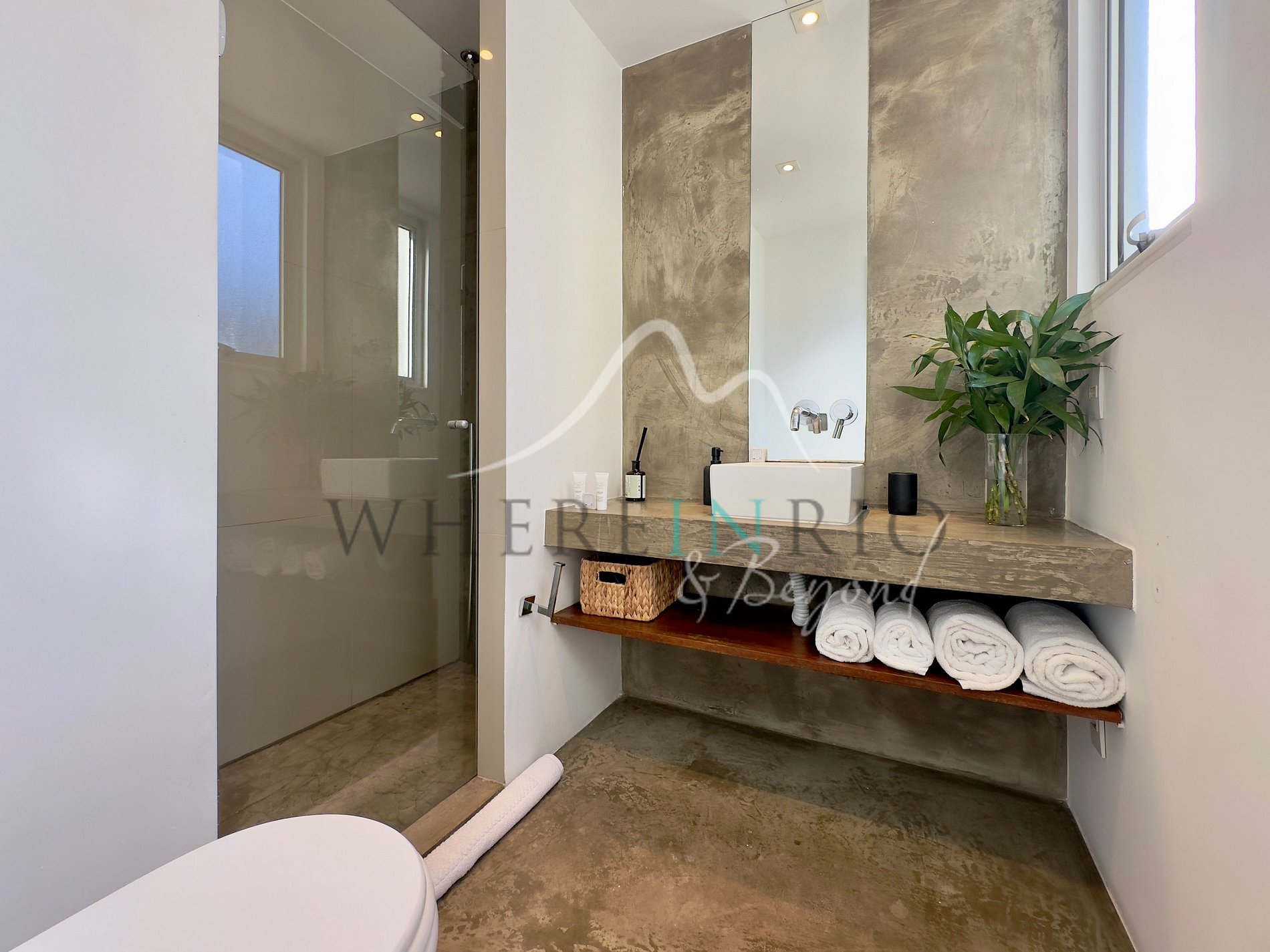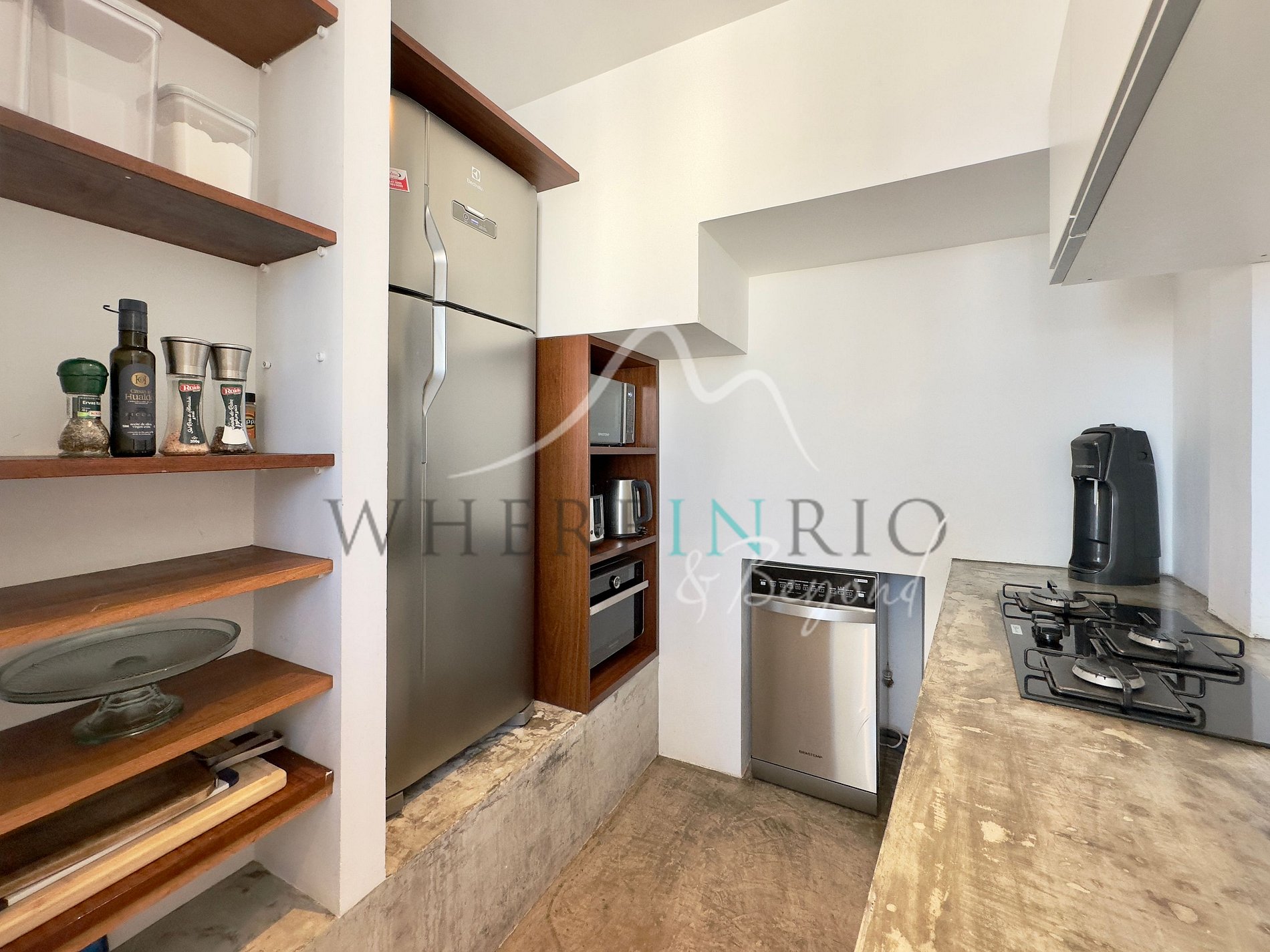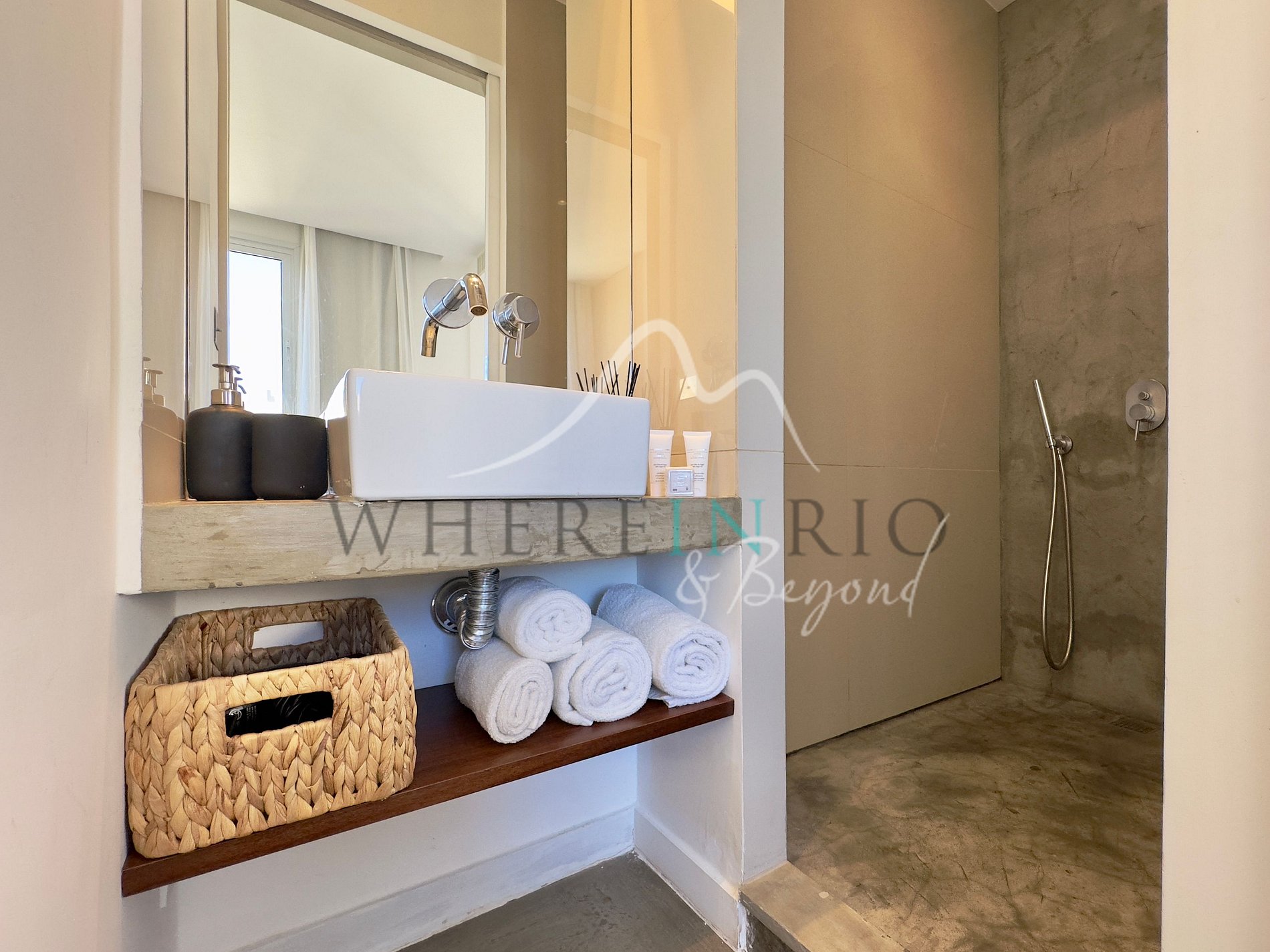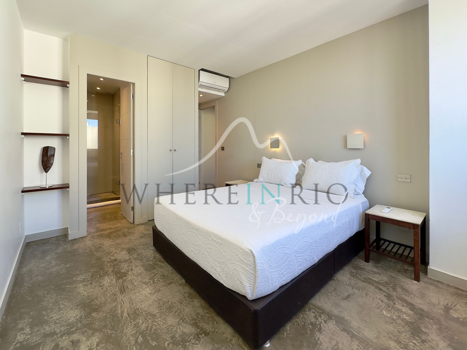 Este triplex iluminado possui quatro suítes: duas com banheiros completos e duas com chuveiro e pia, além de lavabo de apoio. Sala de estar confortável, cozinha americana totalmente equipada e sala de jantar com portas de correr que se abrem para uma ampla varanda com vista panorâmica. O grande destaque é o terraço privativo com piscina, que oferece vistas extraordinárias do Pão de Açúcar, do oceano e do horizonte do Rio—um espetáculo mágico à noite.