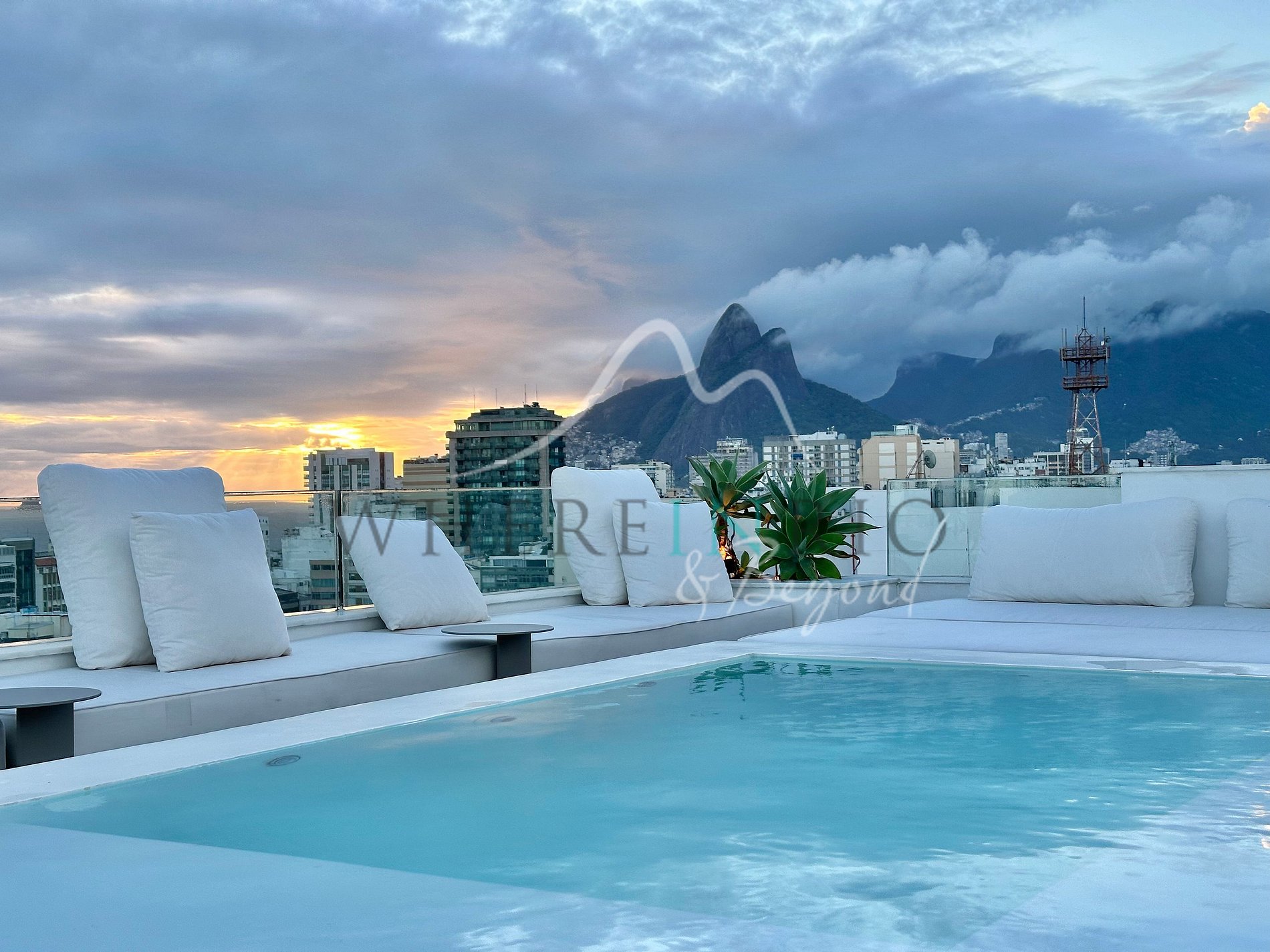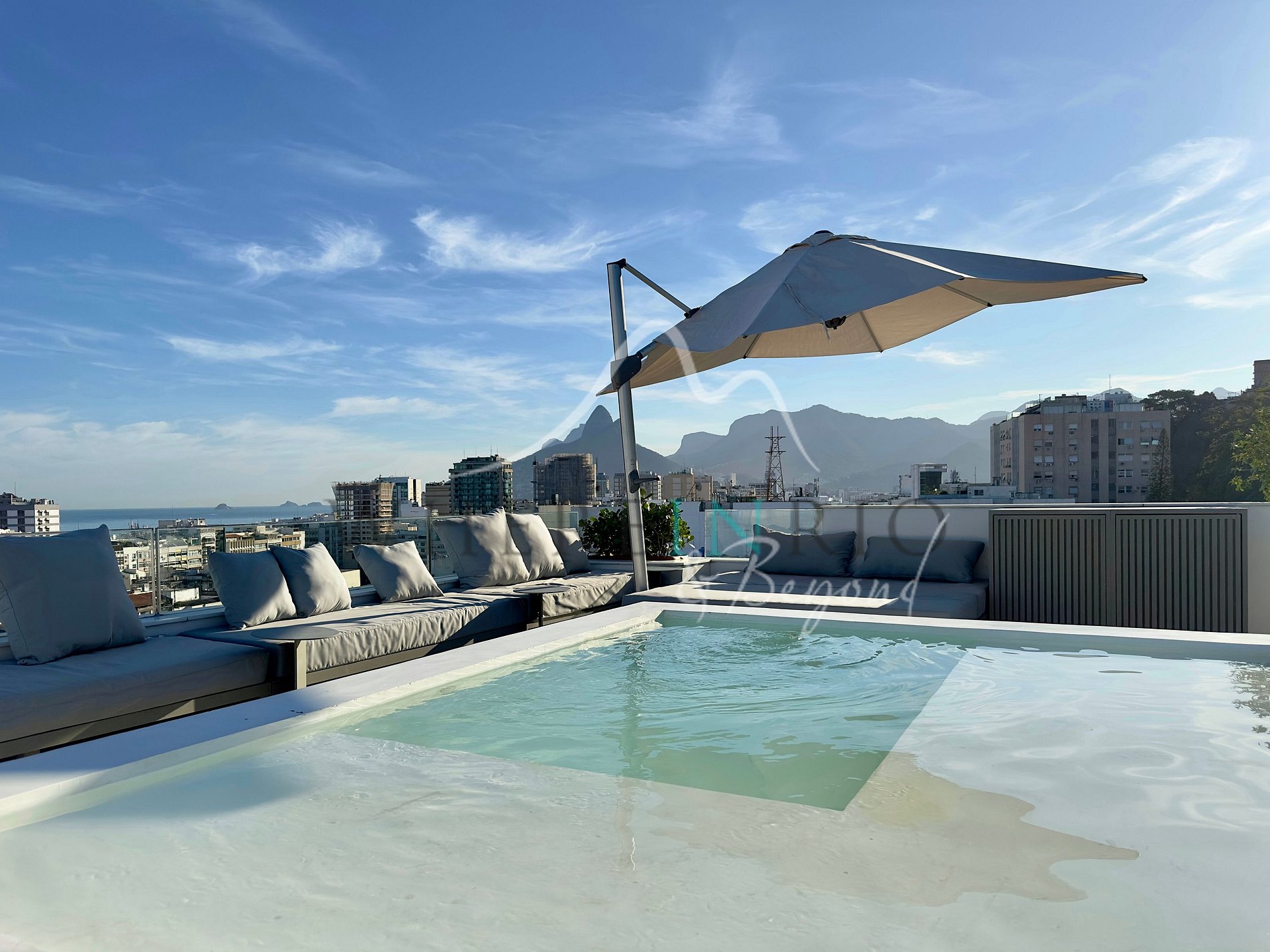 Cobertura triplex de luxo em Ipanema com piscina privativa e vistas panorâmicas do Pão de Açúcar ao oceano. Projeto do arquiteto francês Alexandre Thouet, ideal para férias inesquecíveis no Rio.