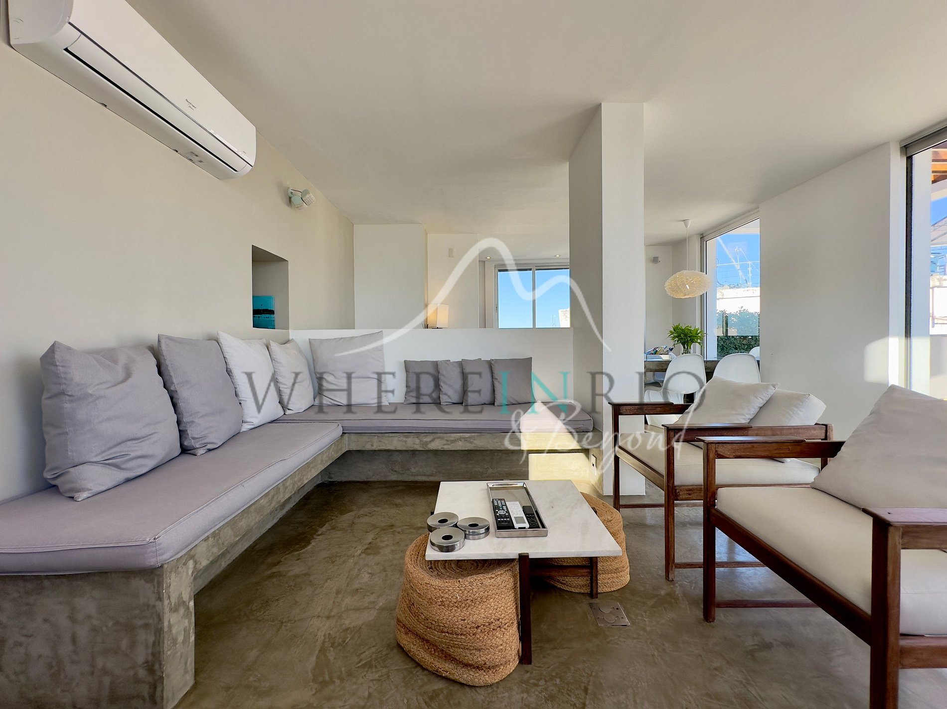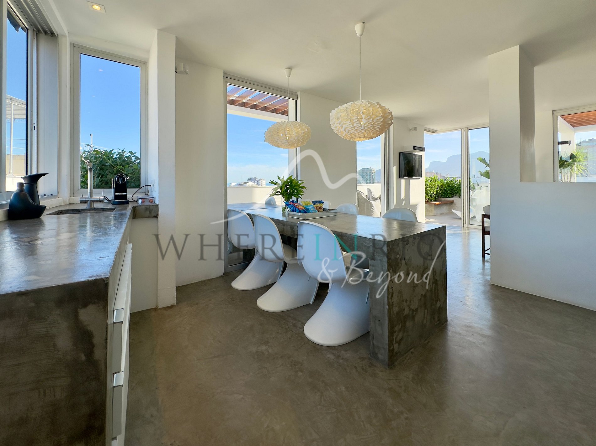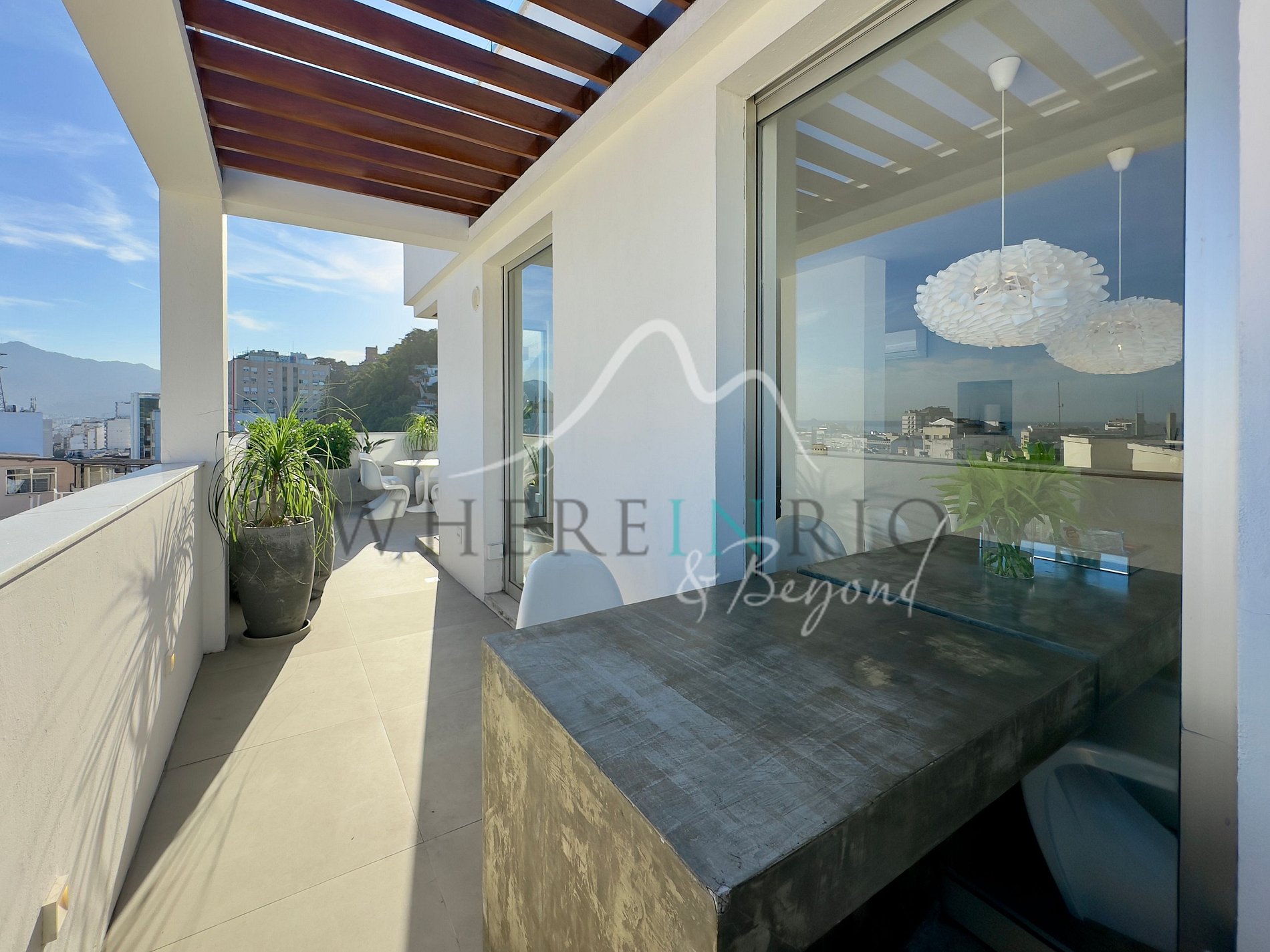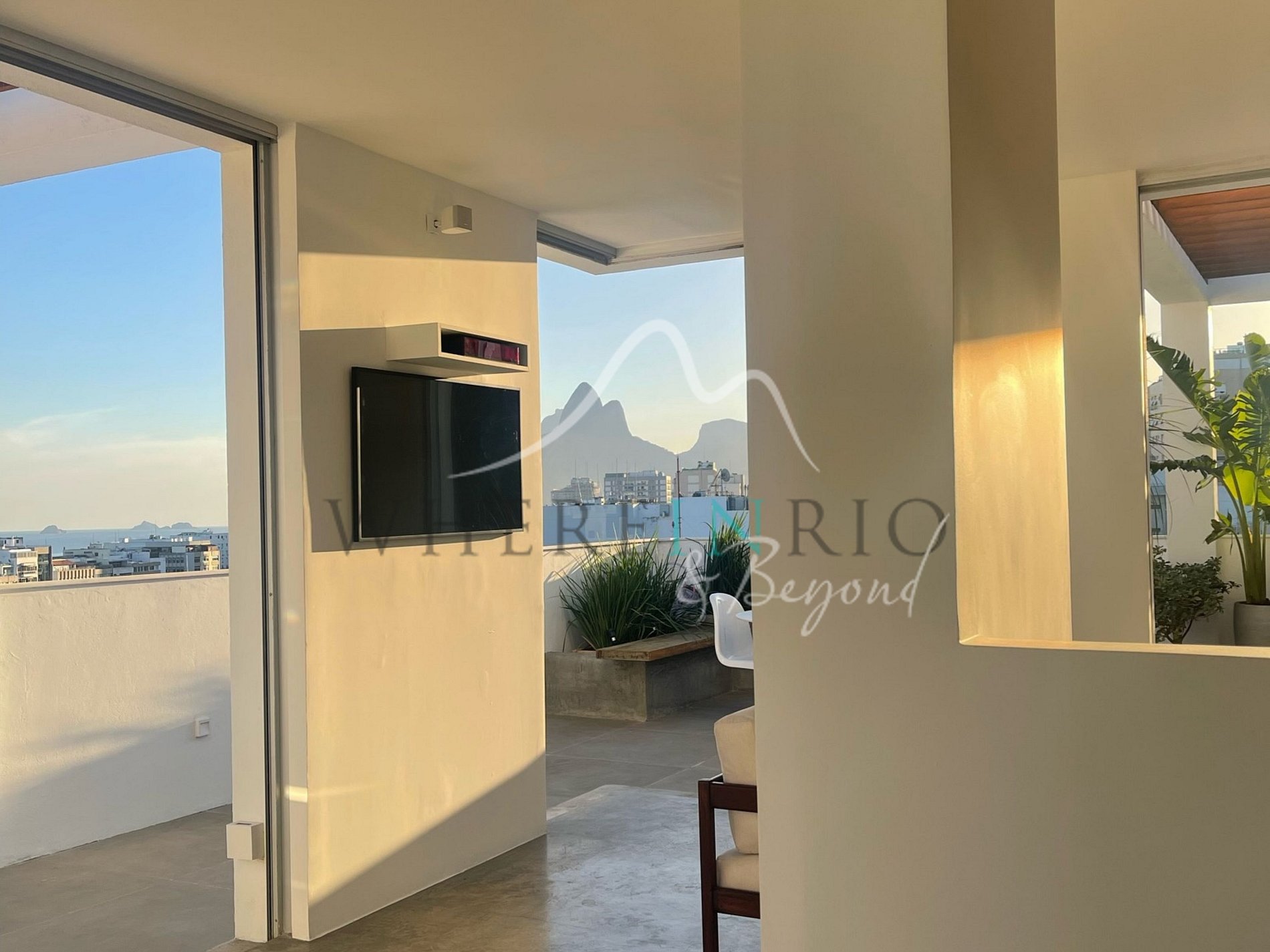Este triplex iluminado possui quatro suítes: duas com banheiros completos e duas com chuveiro e pia, além de lavabo de apoio. Sala de estar confortável, cozinha americana totalmente equipada e sala de jantar com portas de correr que se abrem para uma ampla varanda com vista panorâmica. O grande destaque é o terraço privativo com piscina, que oferece vistas extraordinárias do Pão de Açúcar, do oceano e do horizonte do Rio—um espetáculo mágico à noite.