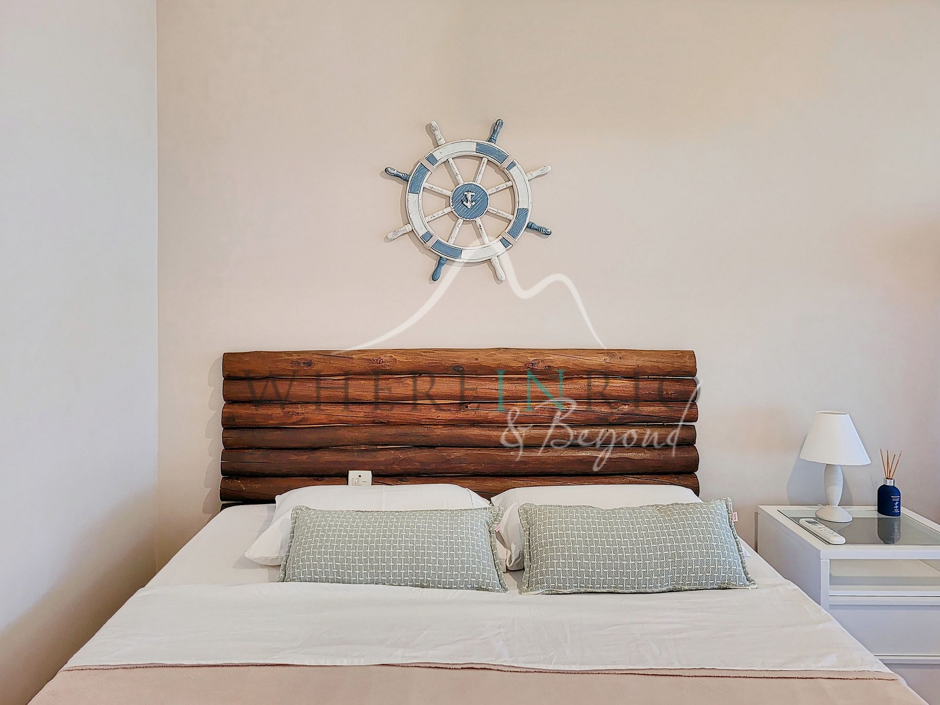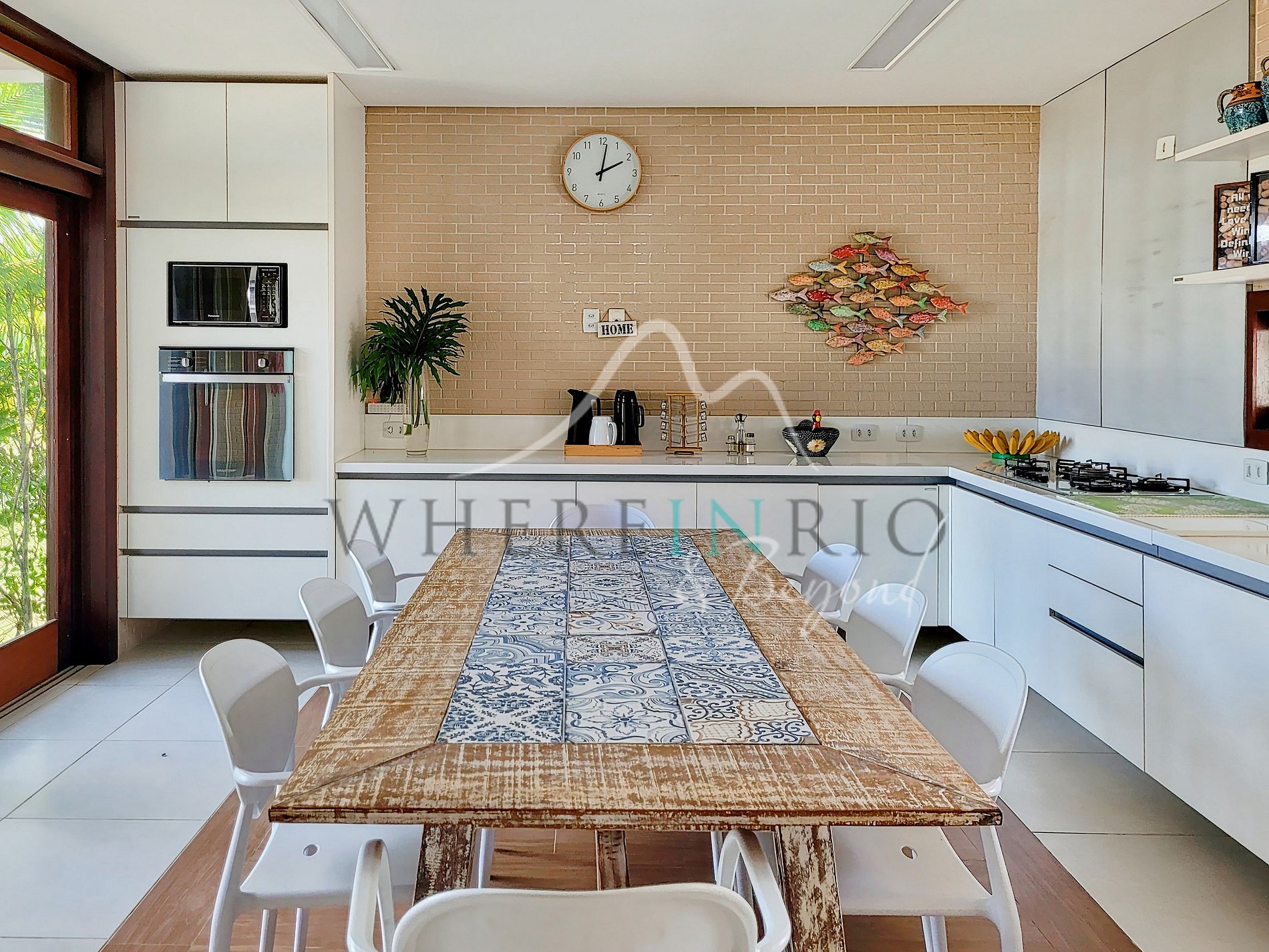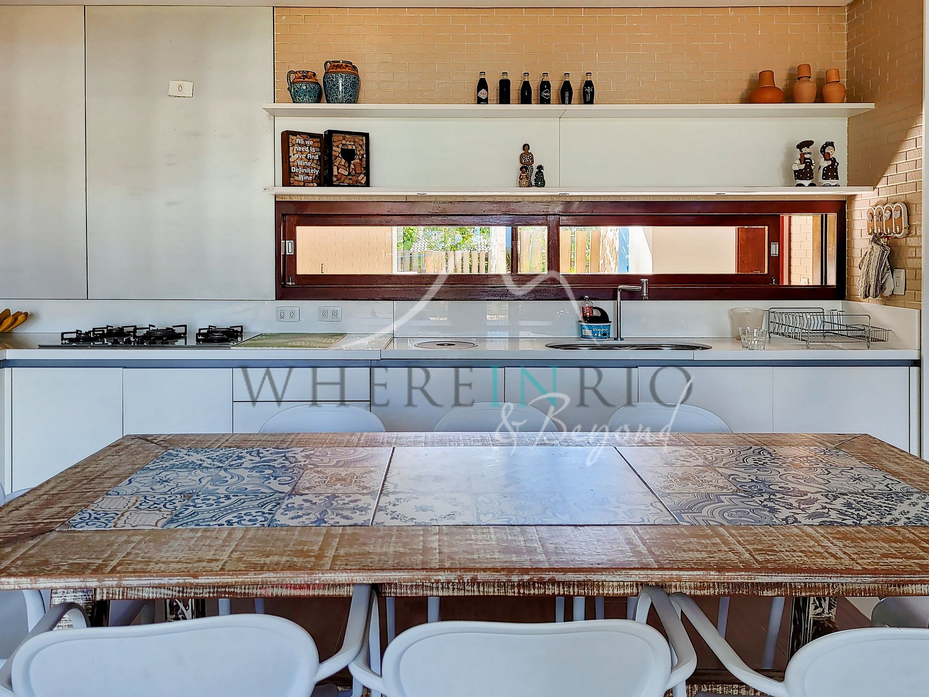 A varanda principal tem um conjunto de sofás e uma mesa redonda para 6 pessoas, a sala de jantar externa tem uma mesa para 10 pessoas. A cozinha está totalmente equipada com despensa, freezer e geladeira, fogão, fogão industrial, forno elétrico, adega de vinho, fonte de água e armários de cozinha. Além disso, você pode desfrutar de uma vista para o mar, e uma boa mesa para até 8 pessoas.