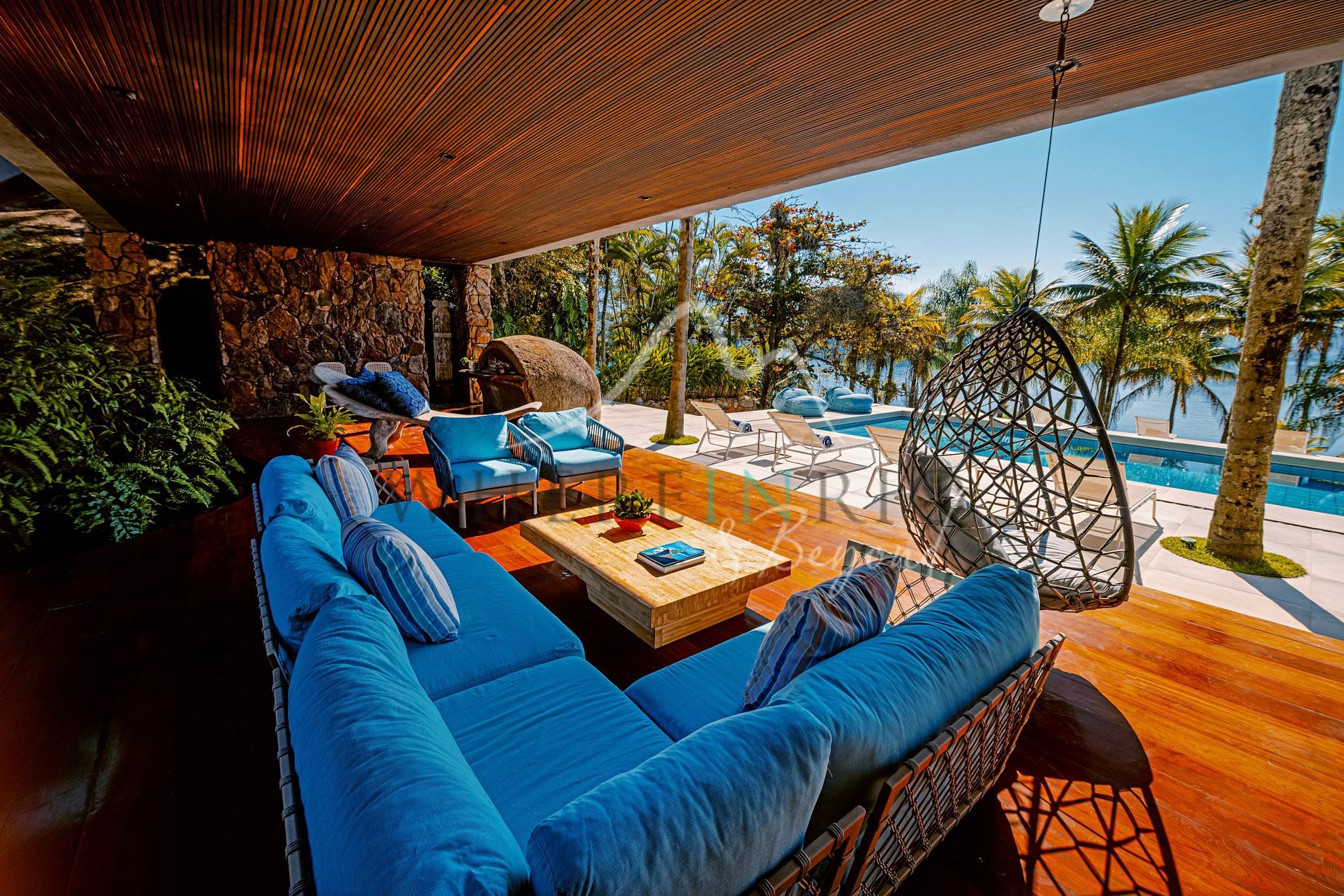 A ilha possui 5 suítes: na Casa Principal, 1 suíte master e 1 suíte king, além de 3 bungalows com vista para o mar. Áreas comuns incluem terraço externo com sala de jantar e churrasqueira, piscina com deck e lounge, solarium, Jacuzzi externa e praia privativa. Heliporto para acesso rápido do Rio ou São Paulo.
