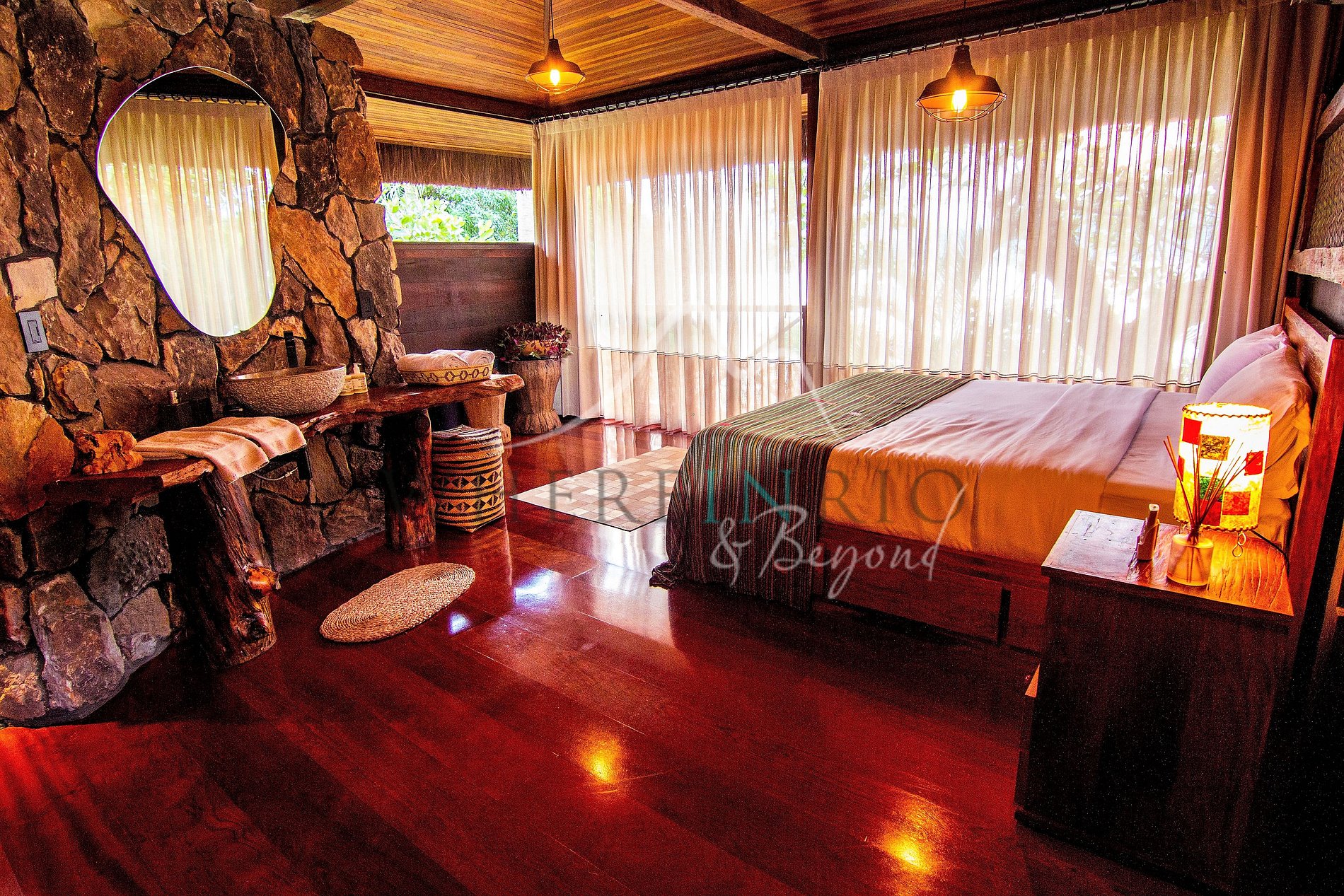 Os hóspedes têm acesso completo à ilha, incluindo a Casa Principal, os bungalows, piscina, jacuzzi, solarium, praia privativa e terraços. Lancha opcional para explorar a região.