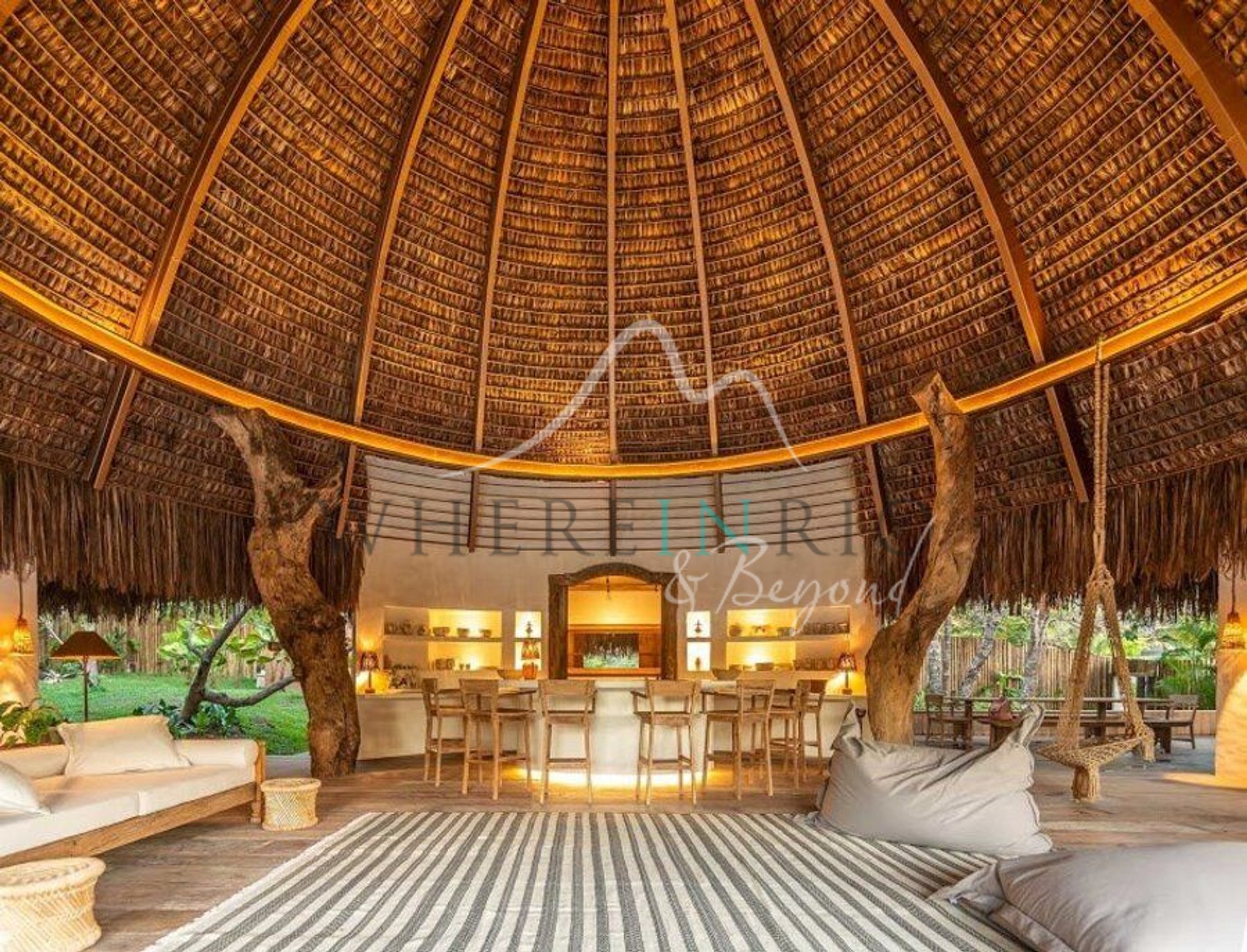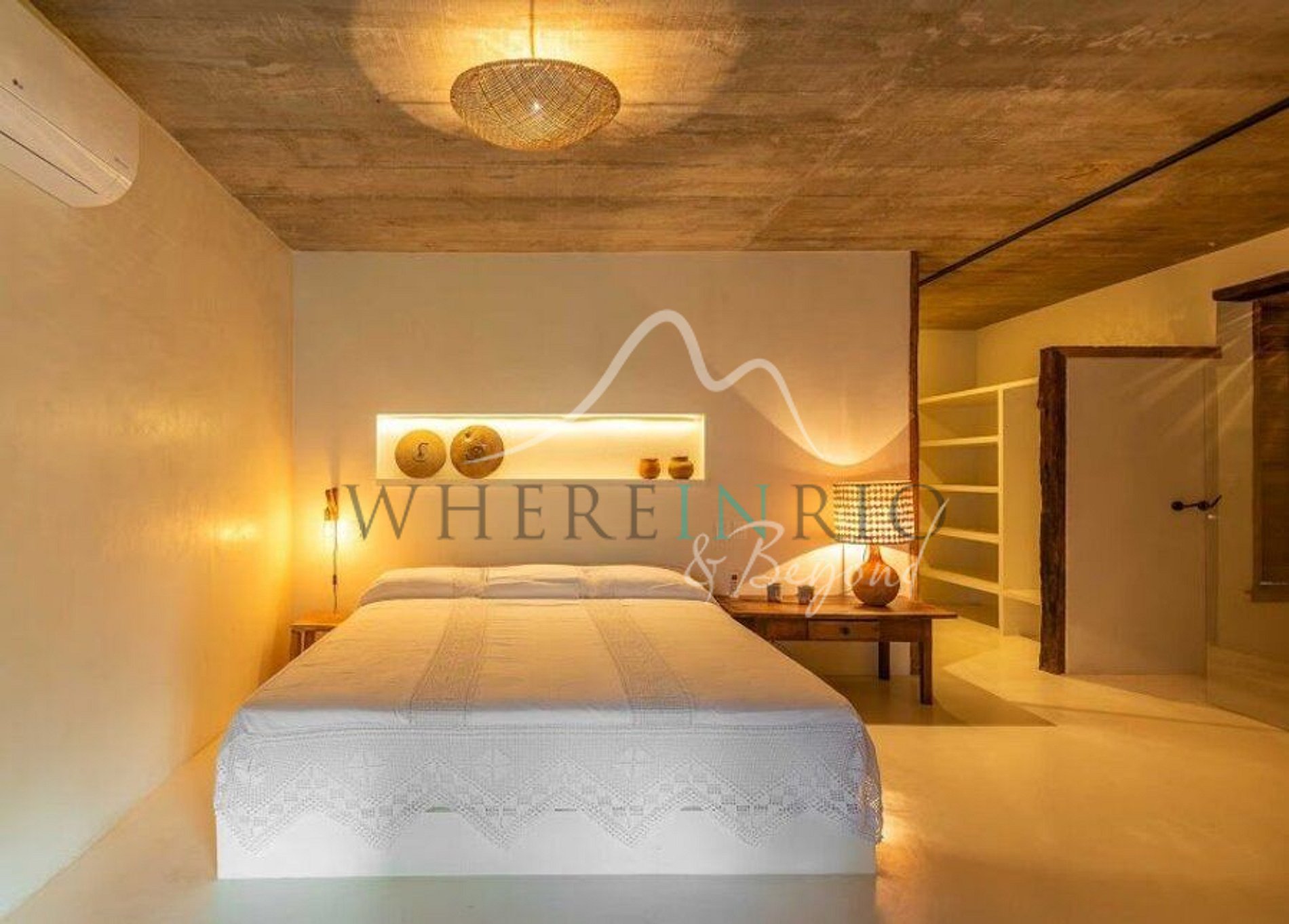 Casa de luxo com 3 quartos no Altos de Trancoso, rodeada por jardim tropical de 5000m², piscina, arquitetura única inspirada na cruz de São Bento e equipe de serviço completa. Um refúgio de paz e inspiração.