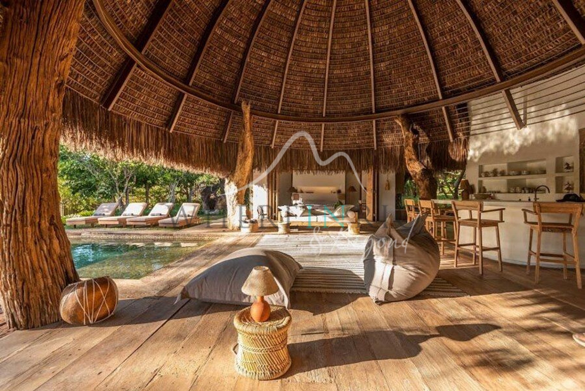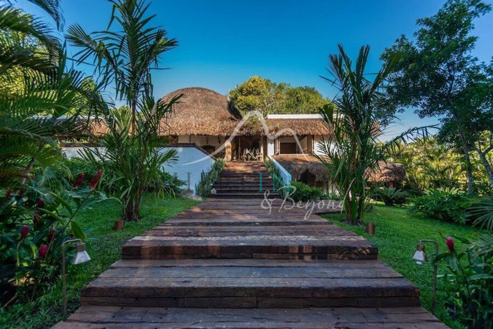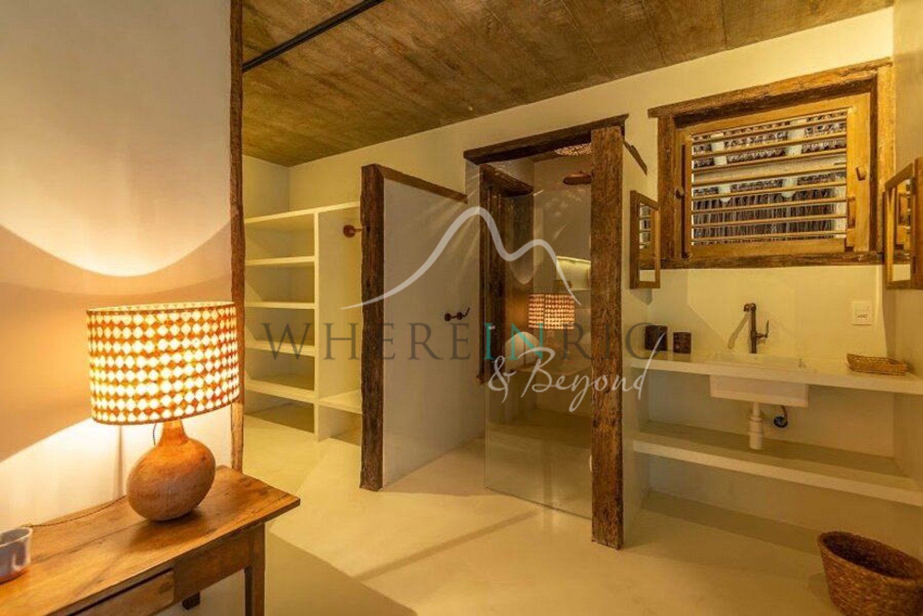 Casa de luxo com 3 quartos no Altos de Trancoso, rodeada por jardim tropical de 5000m², piscina, arquitetura única inspirada na cruz de São Bento e equipe de serviço completa. Um refúgio de paz e inspiração.