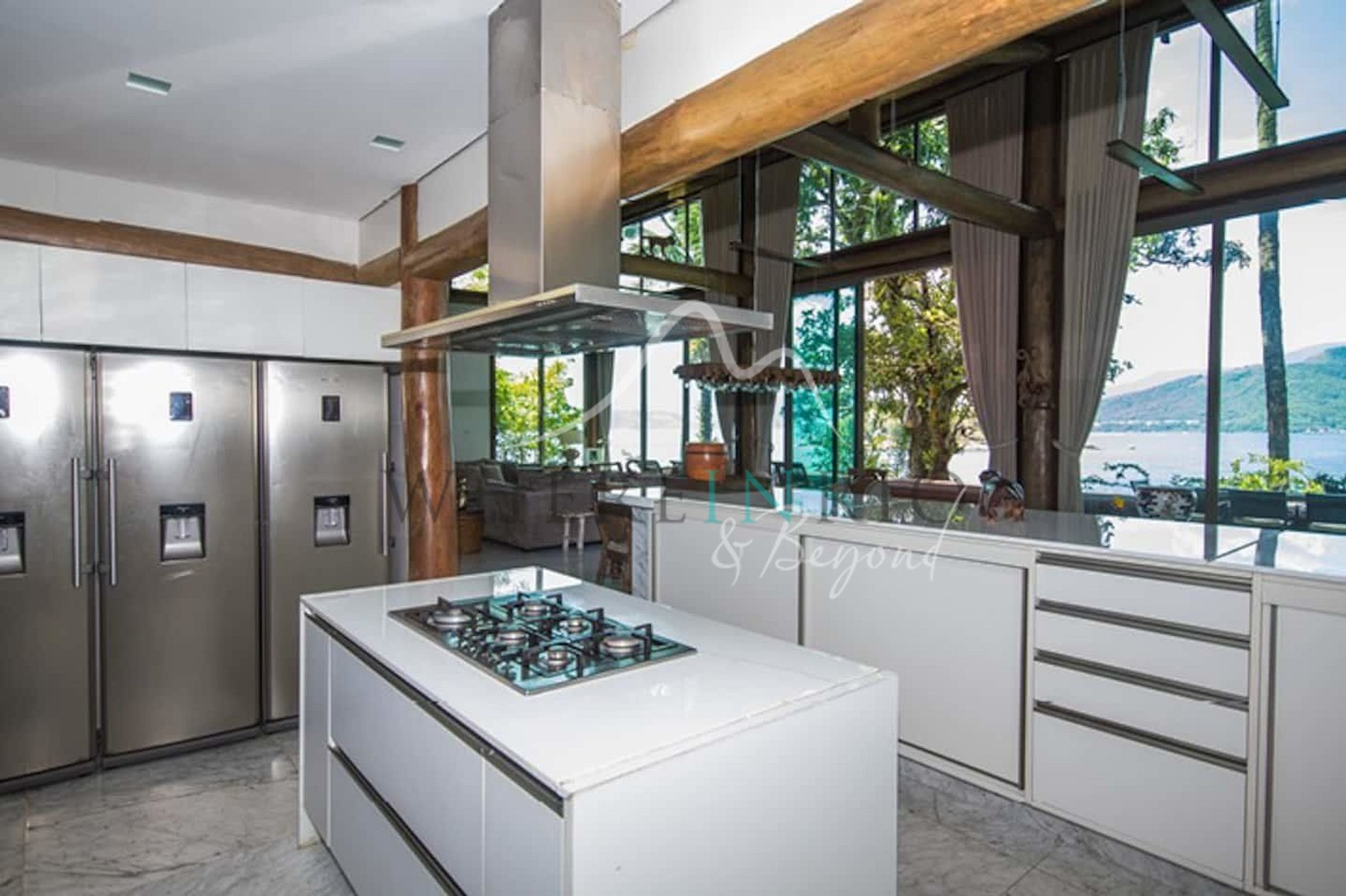 Construída em harmonia com o entorno natural, a casa principal e os bangalôs oferecem suítes espaçosas com terraços privados. A área gourmet inclui churrasqueira profissional, forno de pizza e uma grande mesa de jantar. A sala envidraçada permite que os hóspedes apreciem a vista da Ilha Grande durante as refeições.