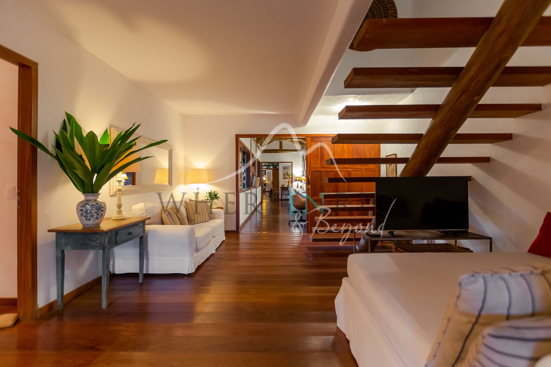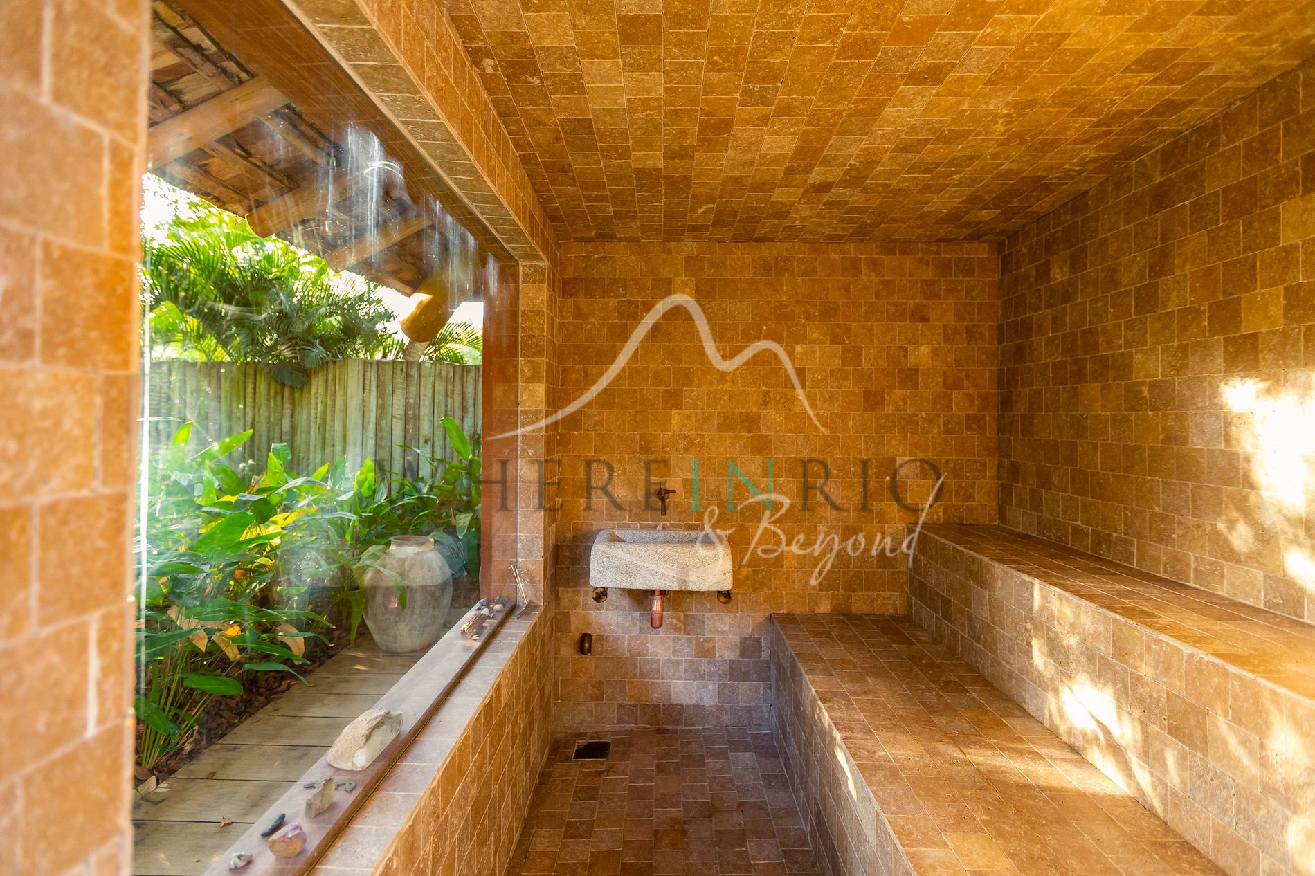 A decoração mistura com sofisticação o estilo local com peças de várias partes do mundo. Os ambientes são amplos e arejados. A casa oferece sauna, piscina, sala de jogos e um bangalô com duchas internas e externas aquecidas — perfeita para relaxar sob as estrelas.