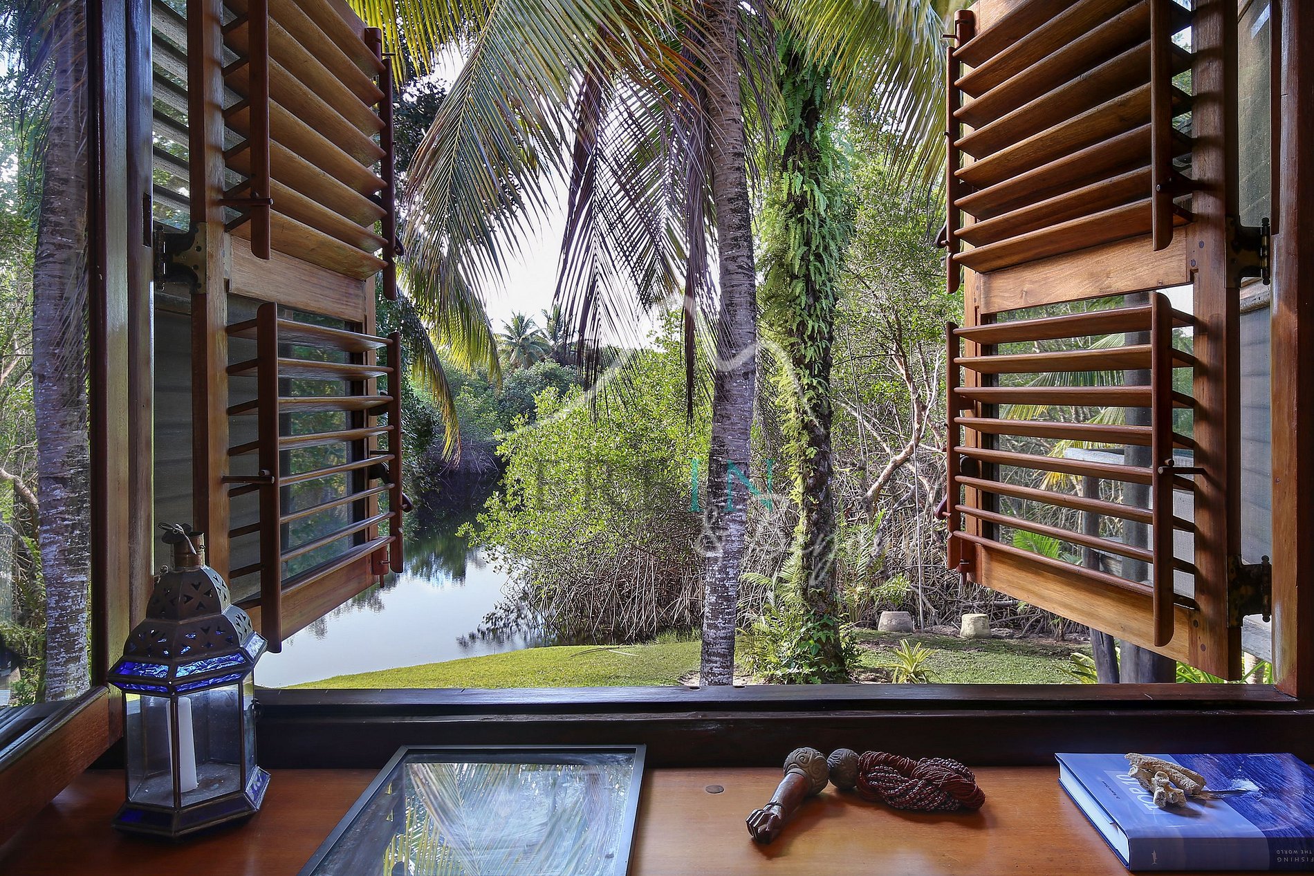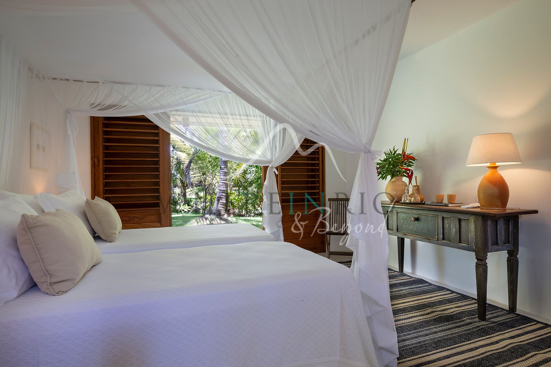 A villa possui 1.200 m² de área construída em um terreno de 37.000 m². São 5 suítes com camas king size e ar-condicionado, incluindo uma suíte master com vista para o mar e para a lagoa. A casa também conta com um amplo salão decorado no estilo baiano, sala de jantar acolhedora, piscina de 25 metros com duas raias, jacuzzi, sauna a vapor, academia com vista para o mar, lounge pé na areia com tendas e espreguiçadeiras. Além disso, oferece 2 caiaques, Wi-Fi, Smart TVs com Netflix, Prime e HBO, enxoval Buddemeyer e amenities.
