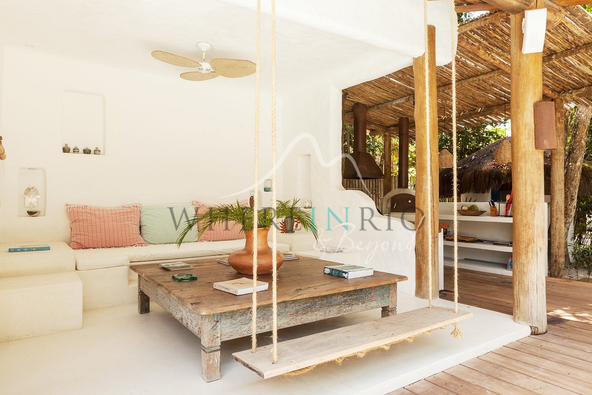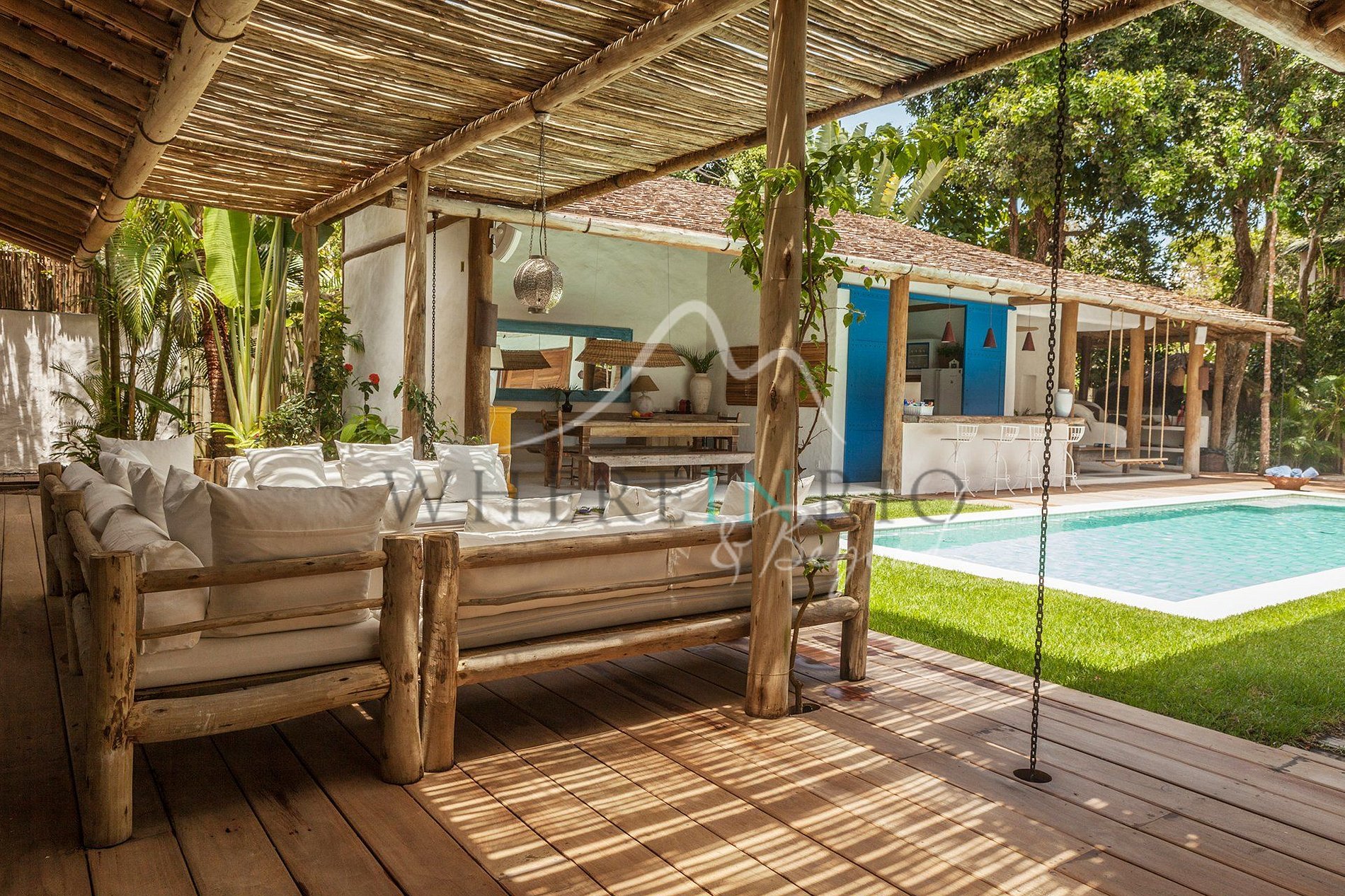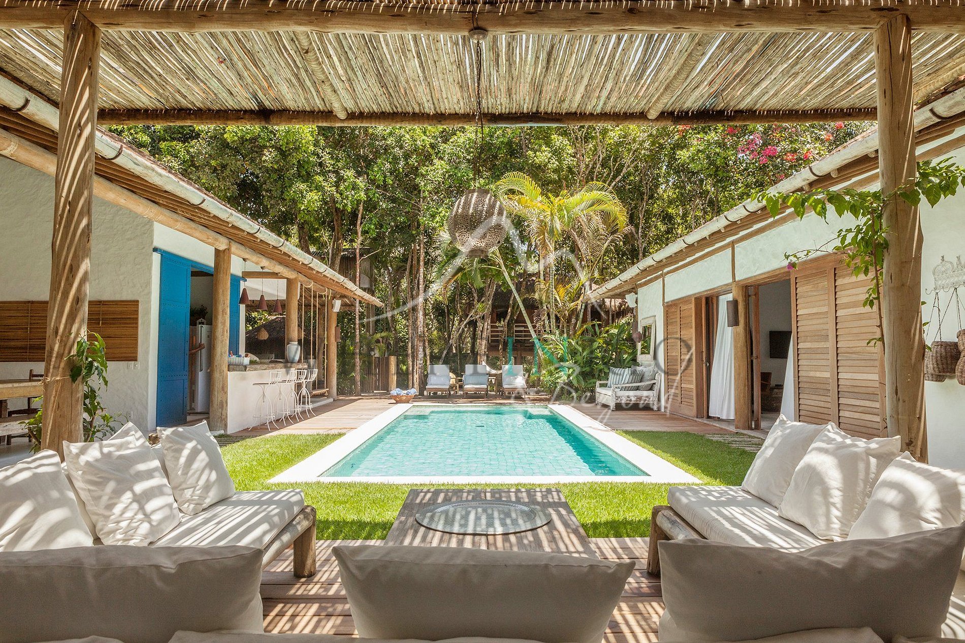 São 4 suítes confortáveis, incluindo uma casa na árvore. A piscina central está rodeada por sala espaçosa, cozinha com estilo mediterrâneo, churrasqueira, terraços e lounges. Tudo decorado com elegância boêmia e tropical.