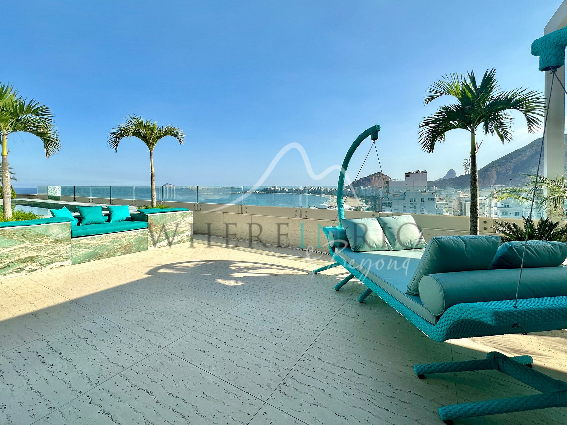 Esta magnífica cobertura de 650 m² proporciona uma vista espetacular da Praia de Copacabana e uma estadia incomparável.