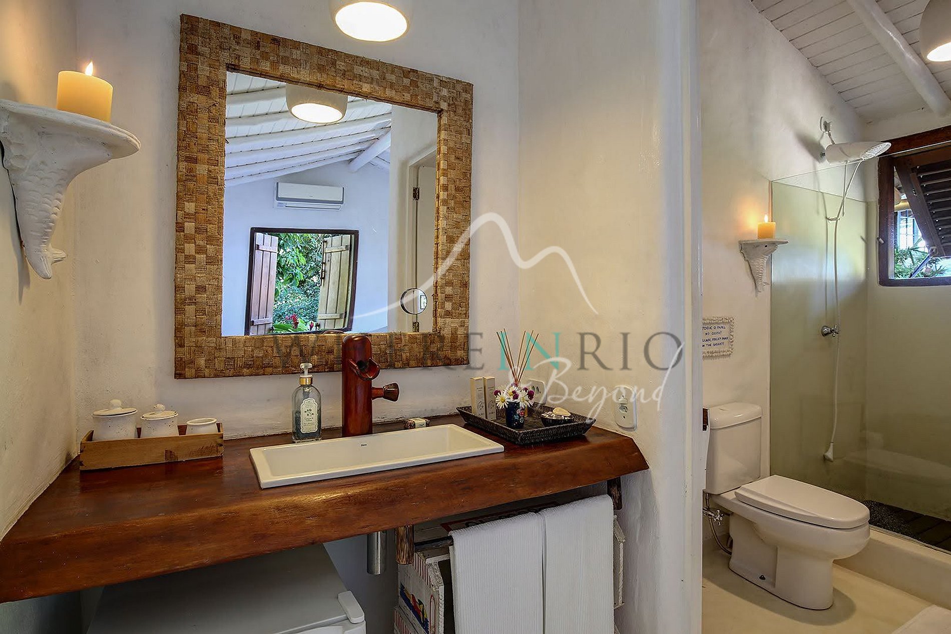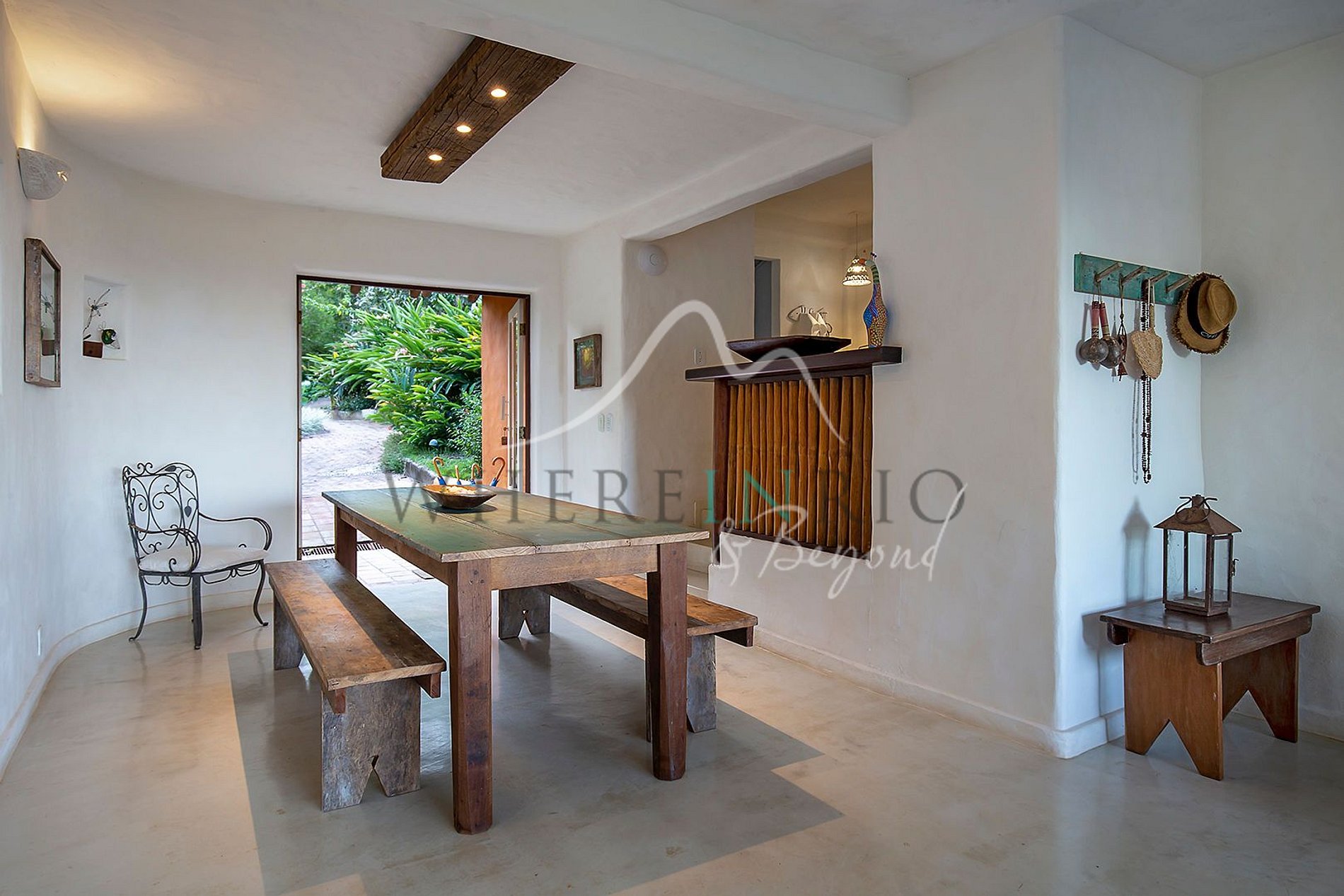 Rodeada pela natureza, a casa é decorada com arte e artesanato brasileiro, combinando conforto e estilo rústico. Com sete suítes, áreas abertas e duas piscinas, oferece um ambiente acolhedor com equipe completa para uma estadia tranquila.